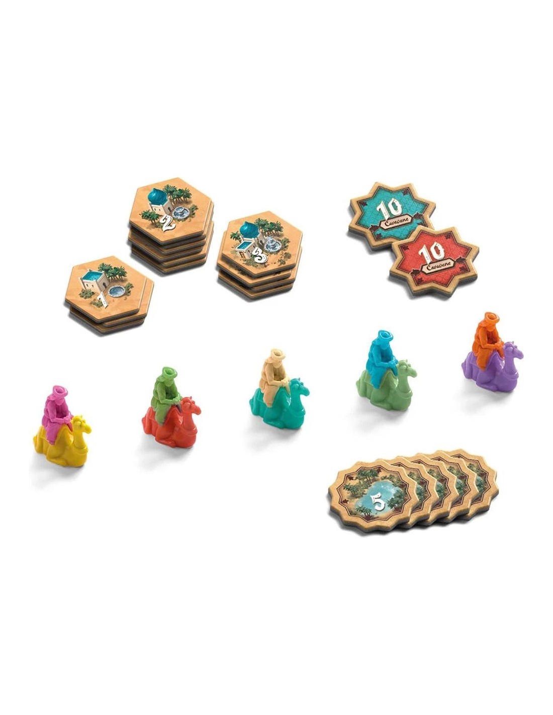 Il y a plusieurs façons de gagner des points et plusieurs façons de remporter la partie. Devriez-vous essayer de construire la plus longue caravane ? Ou devriez-vous dominer les oasis du désert ? N'oubliez pas de garder un œil sur les caravanes de vos adversaires, ou vous risquez de voir votre propre tribu privée de précieux points d'eau.