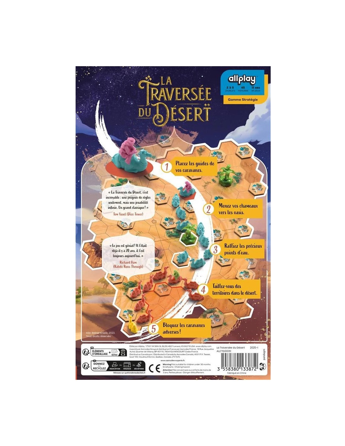Reiner Knizia, le créateur de jeux aux nombreuses récompenses, propose avec La Traversée du Désert un jeu de stratégie captivant, où patience, anticipation et tactique sont les clés de la victoire ! Le désert est toujours traître, mystérieux et sans pitié. Mais pour ceux qui sont prêts à affronter les dangers des sables mouvants et brûlés par le soleil, le désert recèle des richesses incomparables.