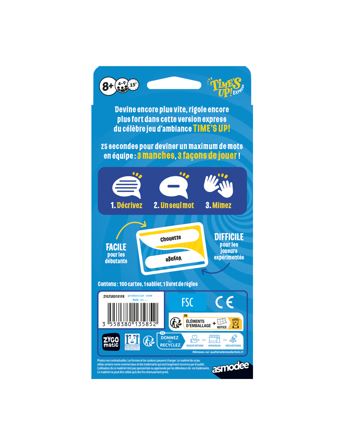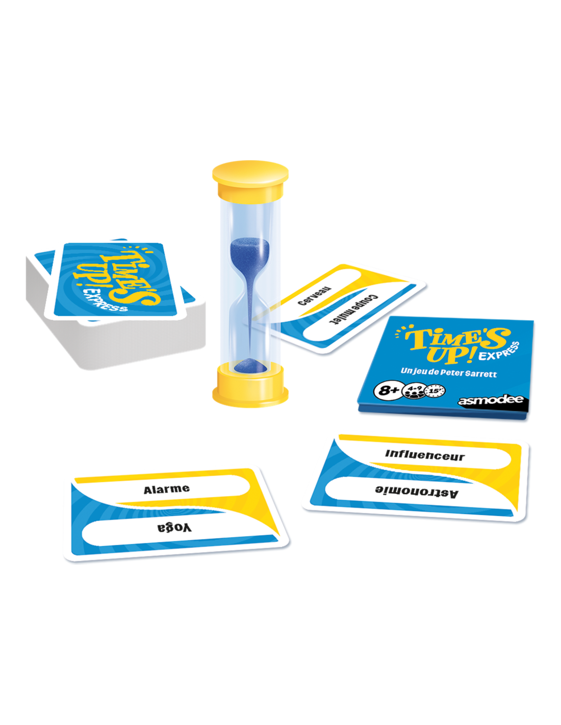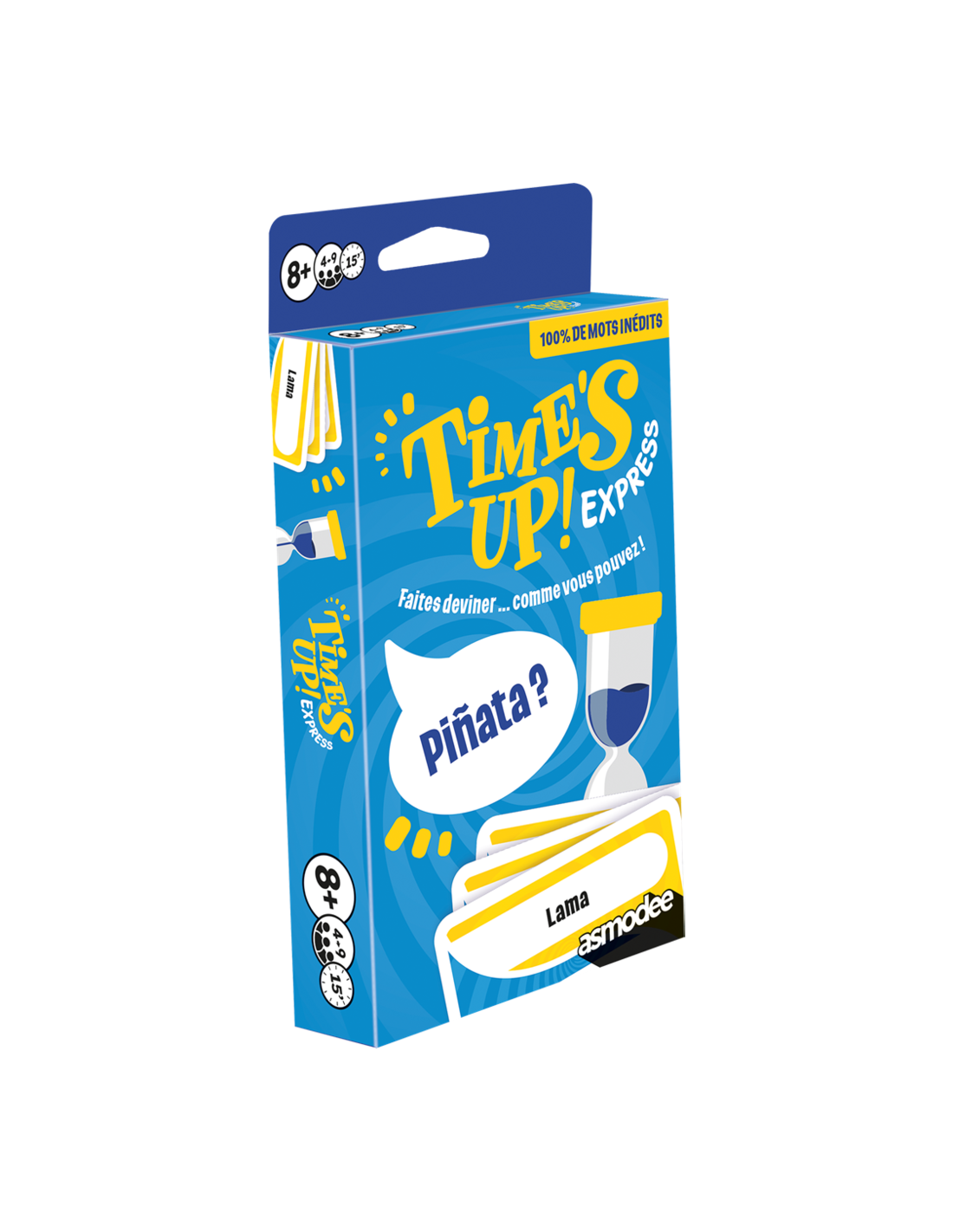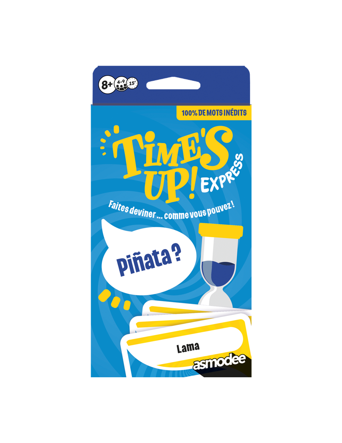 Voici la version Express du best-seller des jeux d'ambiance. Pas besoin de savoir encyclopédique pour s'amuser : un peu d'astuce, d'attention et de mémoire et le tour est joué ! Time's Up express se joue en équipe en 3 manches et le but est toujours de deviner un maximum de cartes : d'abord en décrivant le mot sans le nommer, puis à l'aide d'un seul mot et enfin en mimant.