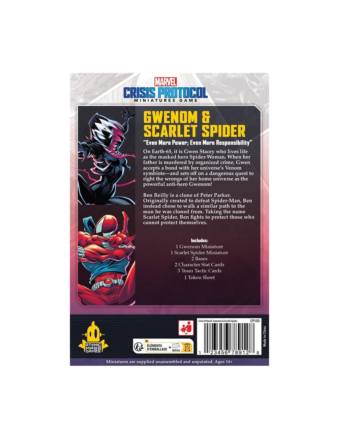 Deux versions alternatives de personnages éminents font leurs débuts dans Marvel : Crisis Protocol dans ce nouveau pack ! Sur Terre-616, Gwen Stacy est morte. Mais sur Terre-65, c'est Peter Parker qui est mort et Gwen Stacy qui vit sa vie en héros masqué. Acceptant un lien avec le symbiote Venom et le pouvoir qu'il offre, elle se lance dans une quête pour réparer les torts de son univers d'origine.