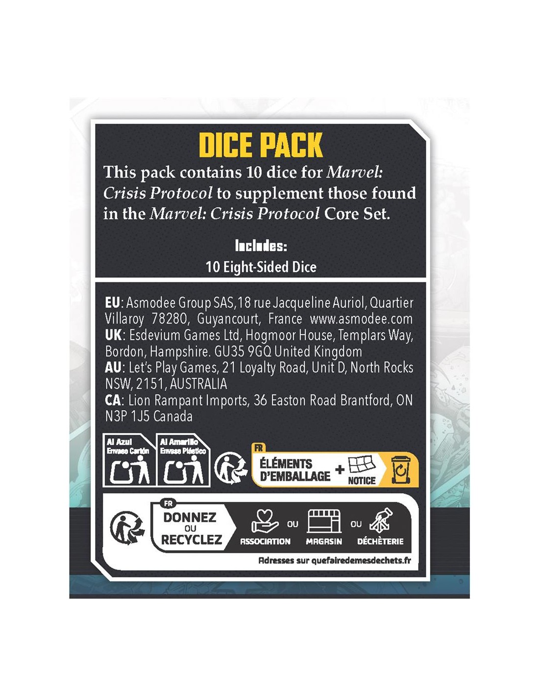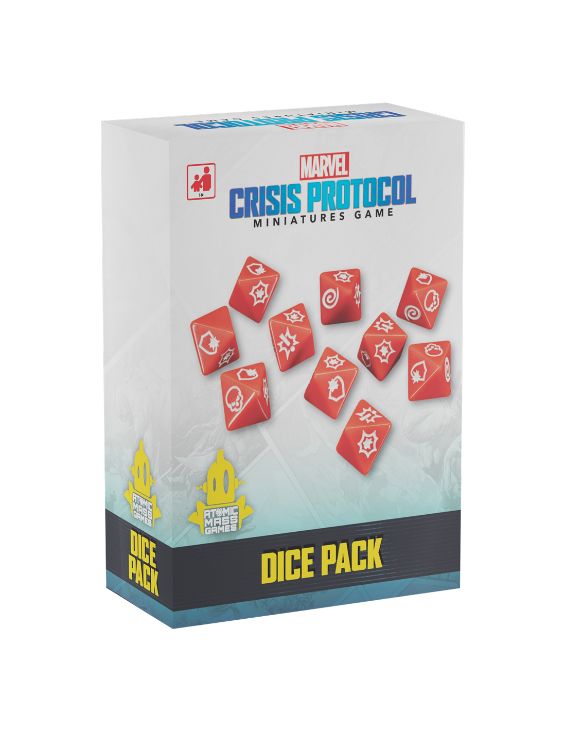 Ce pack contient 10 dés à huit faces pour Marvel : Crisis Protocol en complément ceux trouvés dans la boîte de base. Même si vous avez déjà un jeu complet de dés dans celle-ci, ajouter des dés supplémentaires à votre réserve vous évitera d'avoir à passer des dés pendant partie et d’avoir assez de dés pour les attaques plus importantes.