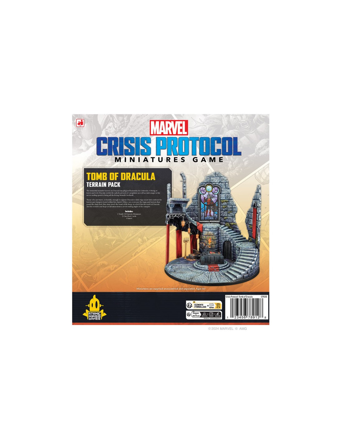 Le Terrain Pack de la Tombe de Dracula ajoute une nouvelle pièce de terrain thématique à Marvel : Crisis Protocol. La Tombe de Dracula est une coupe de l'emblématique château gothique qui rappelle les films classiques. Il comprend des cartes one-shot supplémentaires pour de nouveaux modes de jeu et s'associe au pack de personnages « Monsters Unleashed» pour une présentation de diorama passionnante. Contenu :