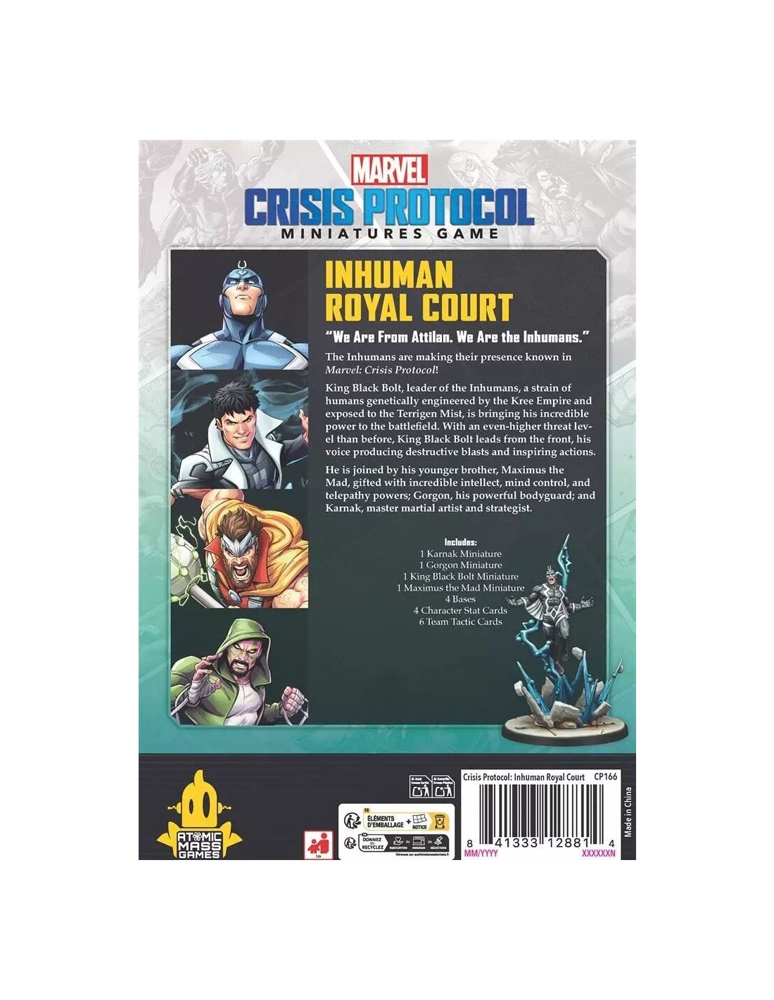 Renforcez les rangs des Inhumains dans Marvel : Crisis Protocol avec Maximus le Fou, Karnak et Gorgone, ainsi qu'une version plus puissante du Roi Black Bolt qui rejoignent le combat. Exposés à la brume Terratogène, ces Inhumains constituent un groupe passionnant de héros et de méchants dans l'Univers Marvel.