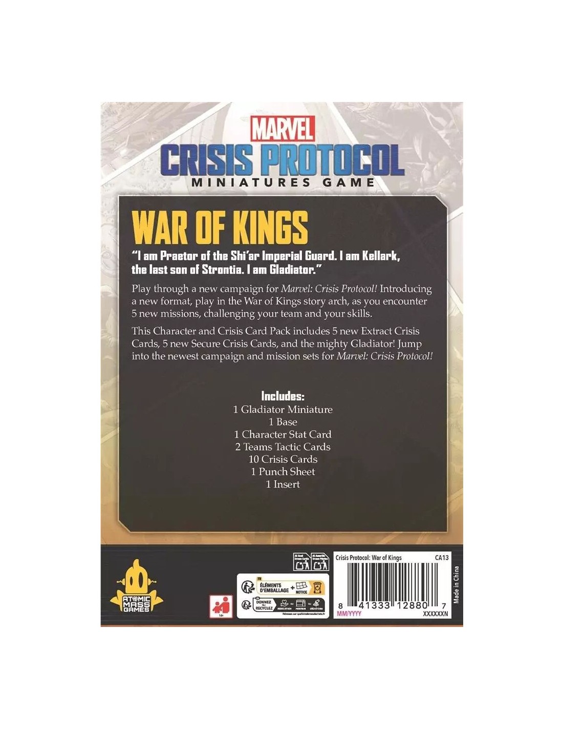 Le puissant Gladiateur est également inclus ! Plongez dans cette campagne et cet ensemble de missions pour Marvel : Crisis Protocol ! En plus des nouvelles cartes de crise que les joueurs peuvent ajouter aux parties standard de Crisis Protocol, ce pack introduit un nouveau système de campagne qui permet de jouer 5 missions narratives construites à partir des paires de cartes de crise de ce pack.