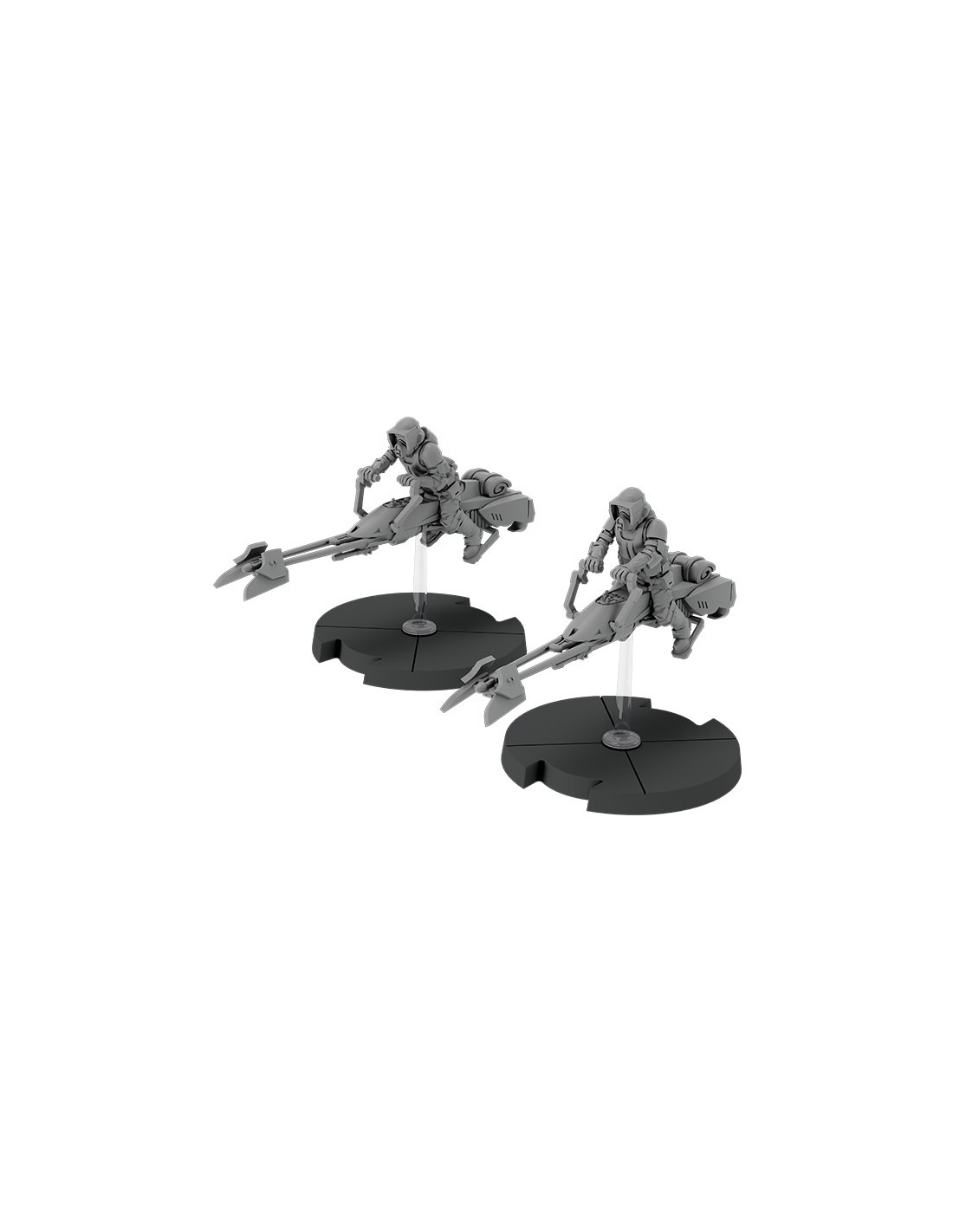 Parcourant les champs de bataille à des vitesses incroyables, les speederbikes sont les véhicules d’intervention rapide de l’Empire Galactique. Souvent équipés de systèmes de brouillage ou de communication à longue portée, l’Empire utilise les speederbikes pour perturber les communications ennemies et harceler les petites formations de soldats, ou pour couvrir de grandes portions d’un champ de bataille en multipliant les zones de déploiement.