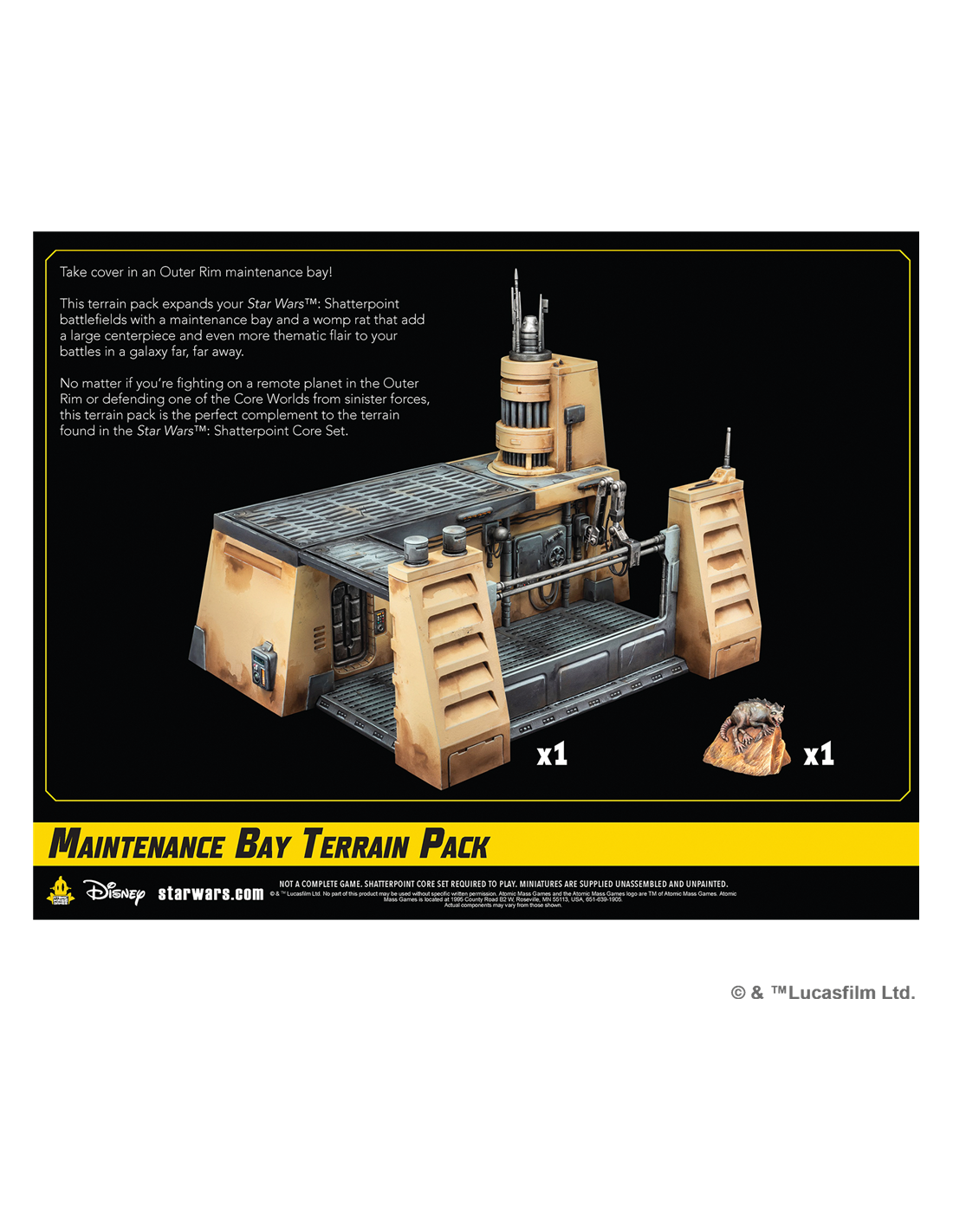 Mettez-vous à l’abri dans ce hangar de maintenance de la Bordure Extérieure ! Ce set de terrain ajoute un nouveau couvert à vos champs de bataille de Star Wars™ : Shatterpoint, sous la forme d’un hangar de maintenance, accompagné d’un rat Womp, qui deviendra l’élément central de votre décor pour toujours plus d’immersion au cœur de cette galaxie lointaine, très lointaine...