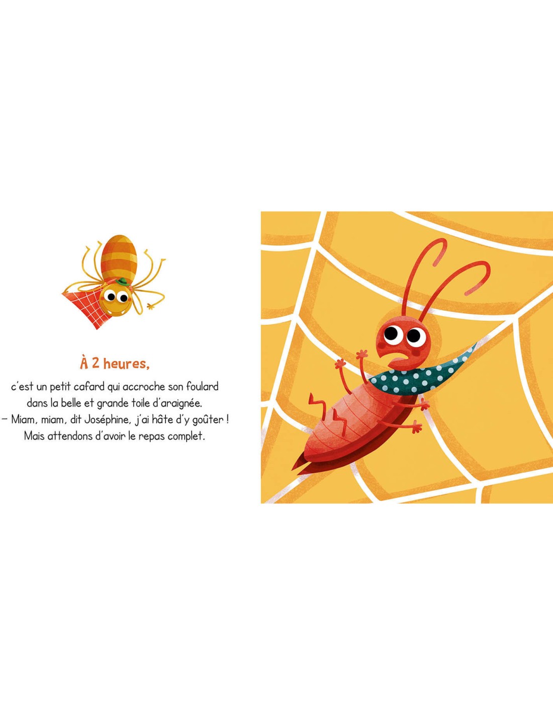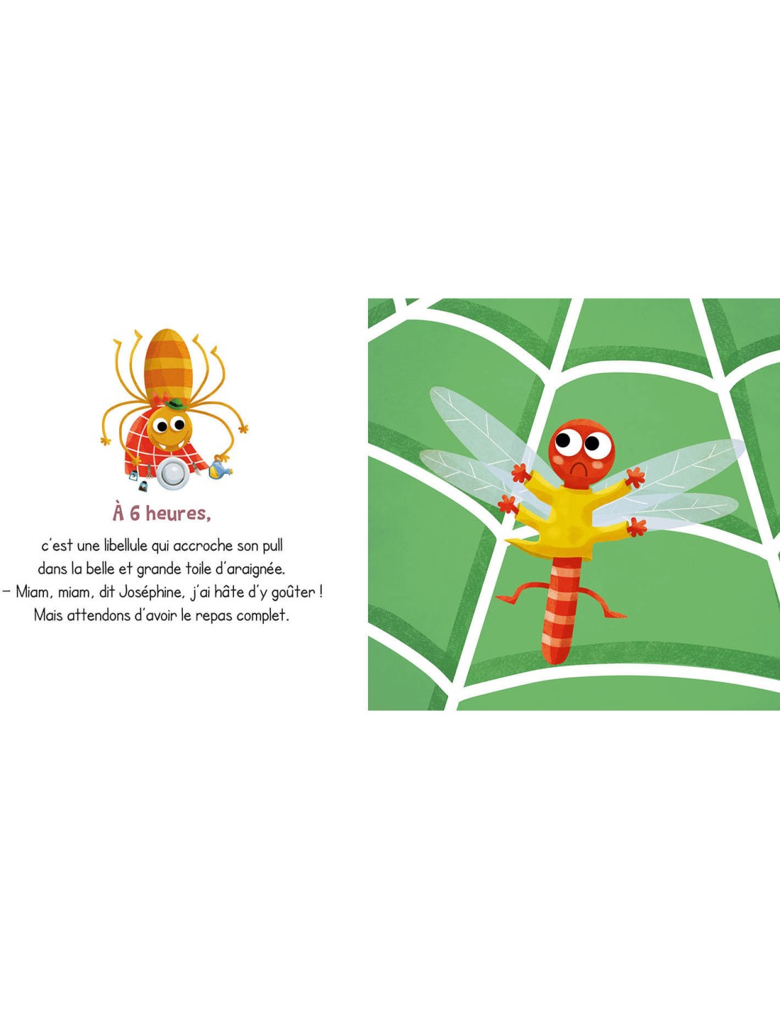 Joséphine l’araignée a tissé sa toile toute la matinée. Au cours des heures de la journée, elle attrape un scarabée, un cafard, une mouche…Aura-elle un repas complet ?