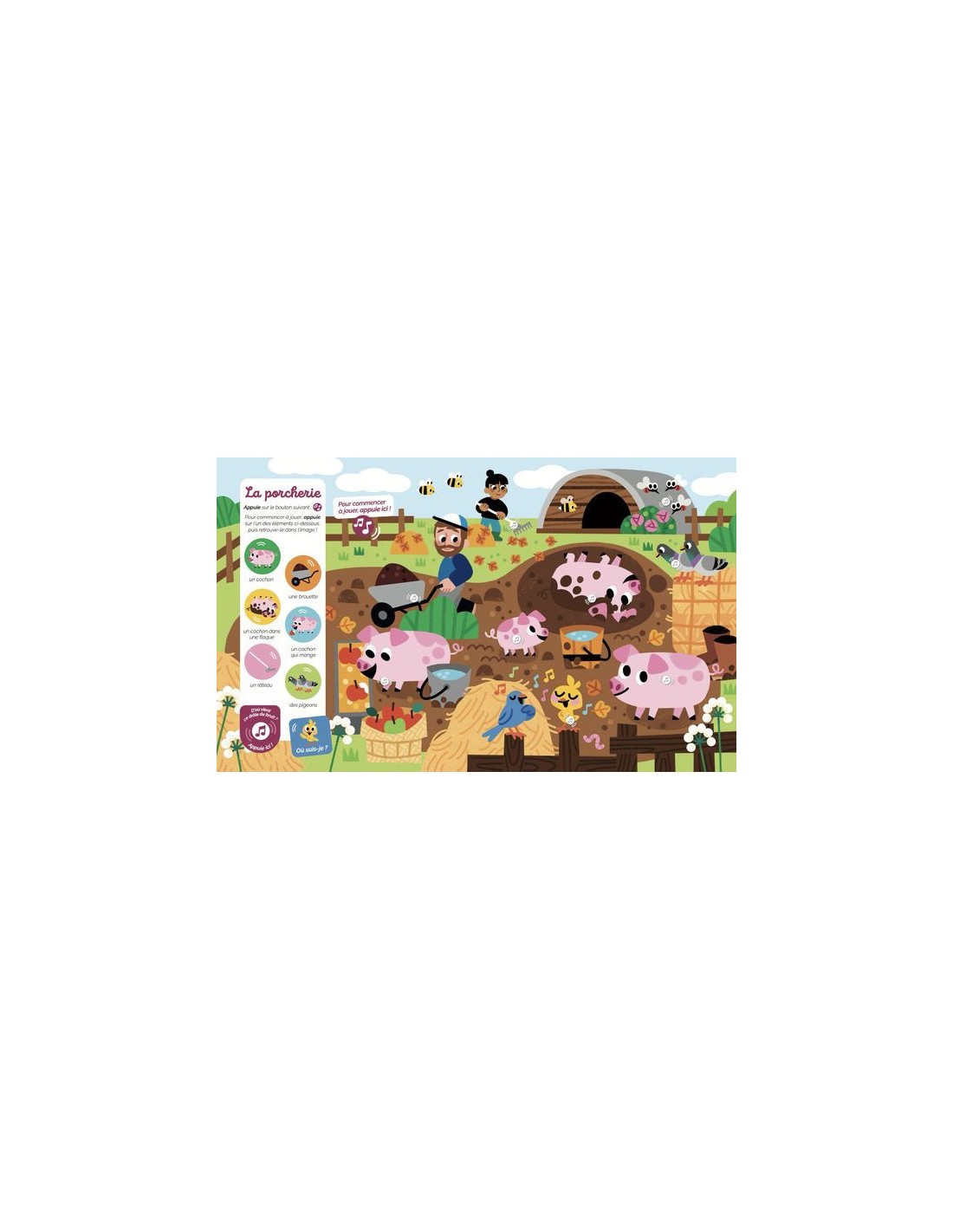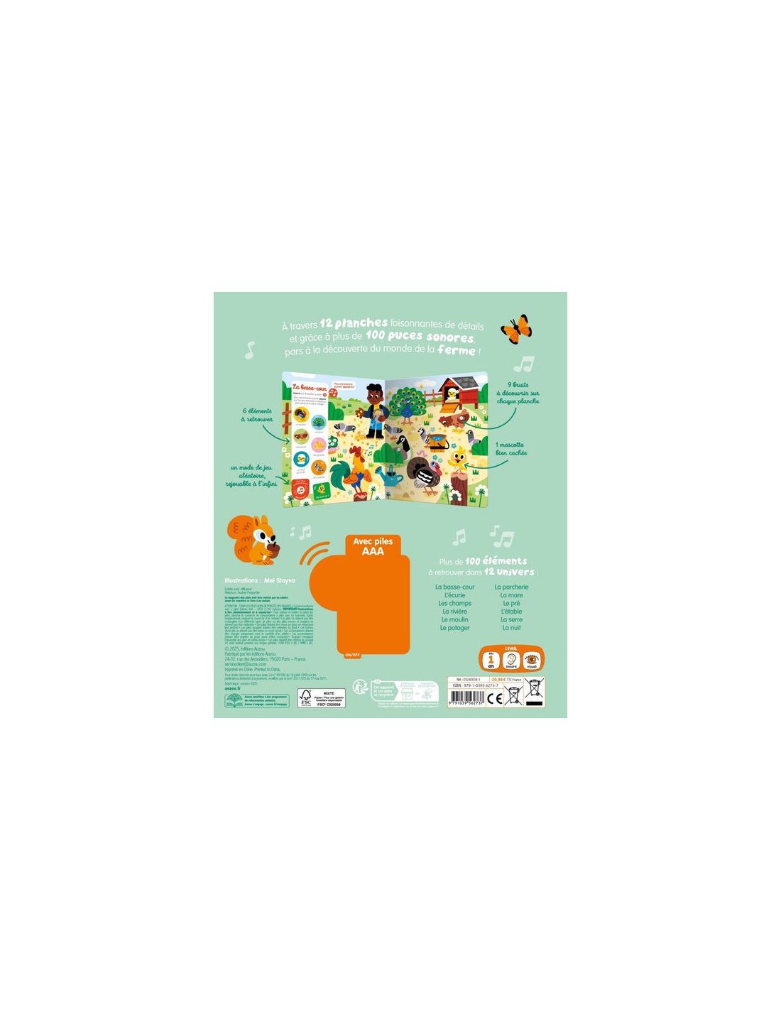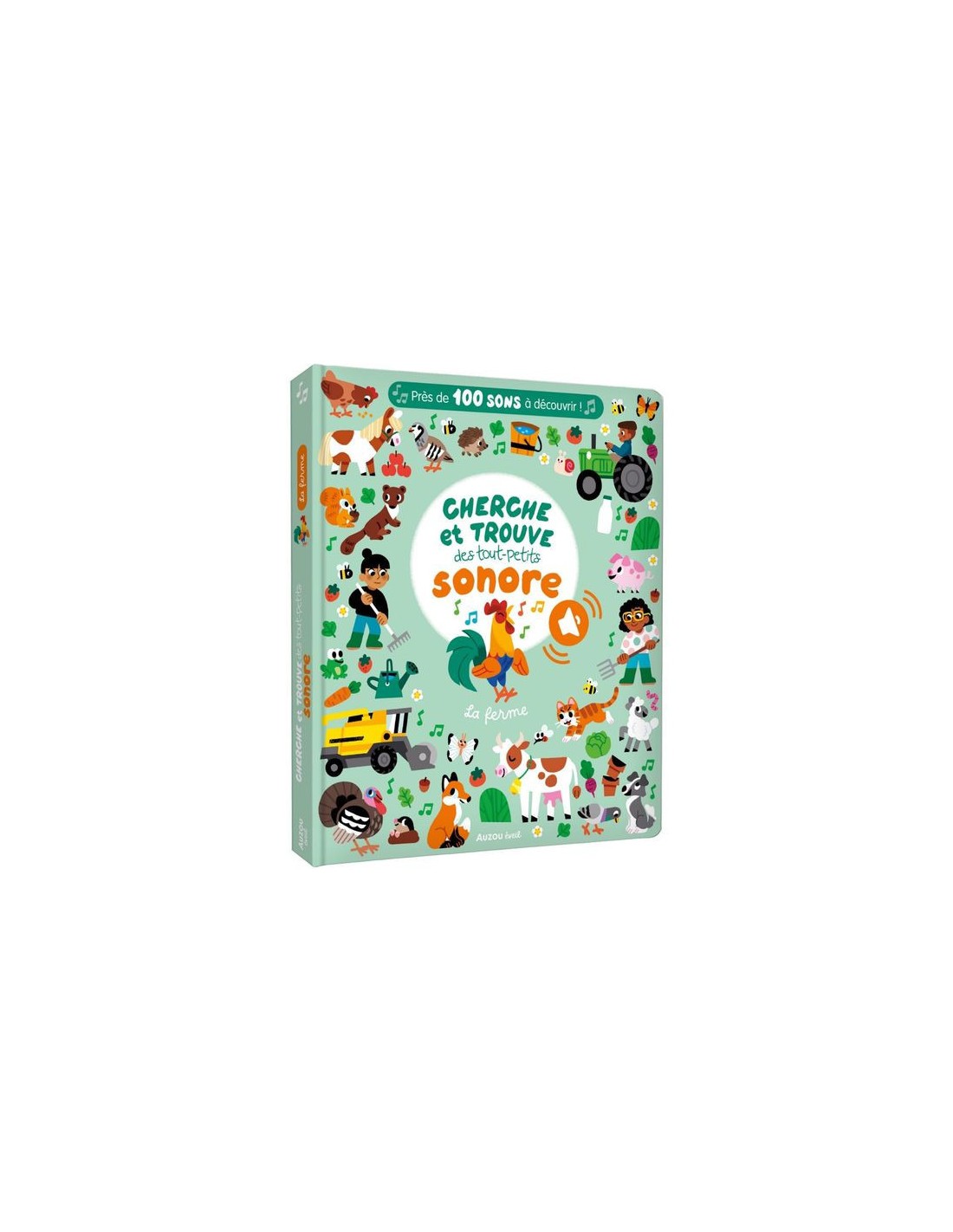 Dans ce nouveau cherche et trouve sonore, le tout-petit explore le monde de la ferme à travers 12 planches foisonnantes de détails et près de 100 sons à découvrir ! Sur chaque double-page, il observe et écoute attentivement pour retrouver 6 animaux et une mascotte qui se cache chacun des univers : la basse-cour, l'étable, le pré...