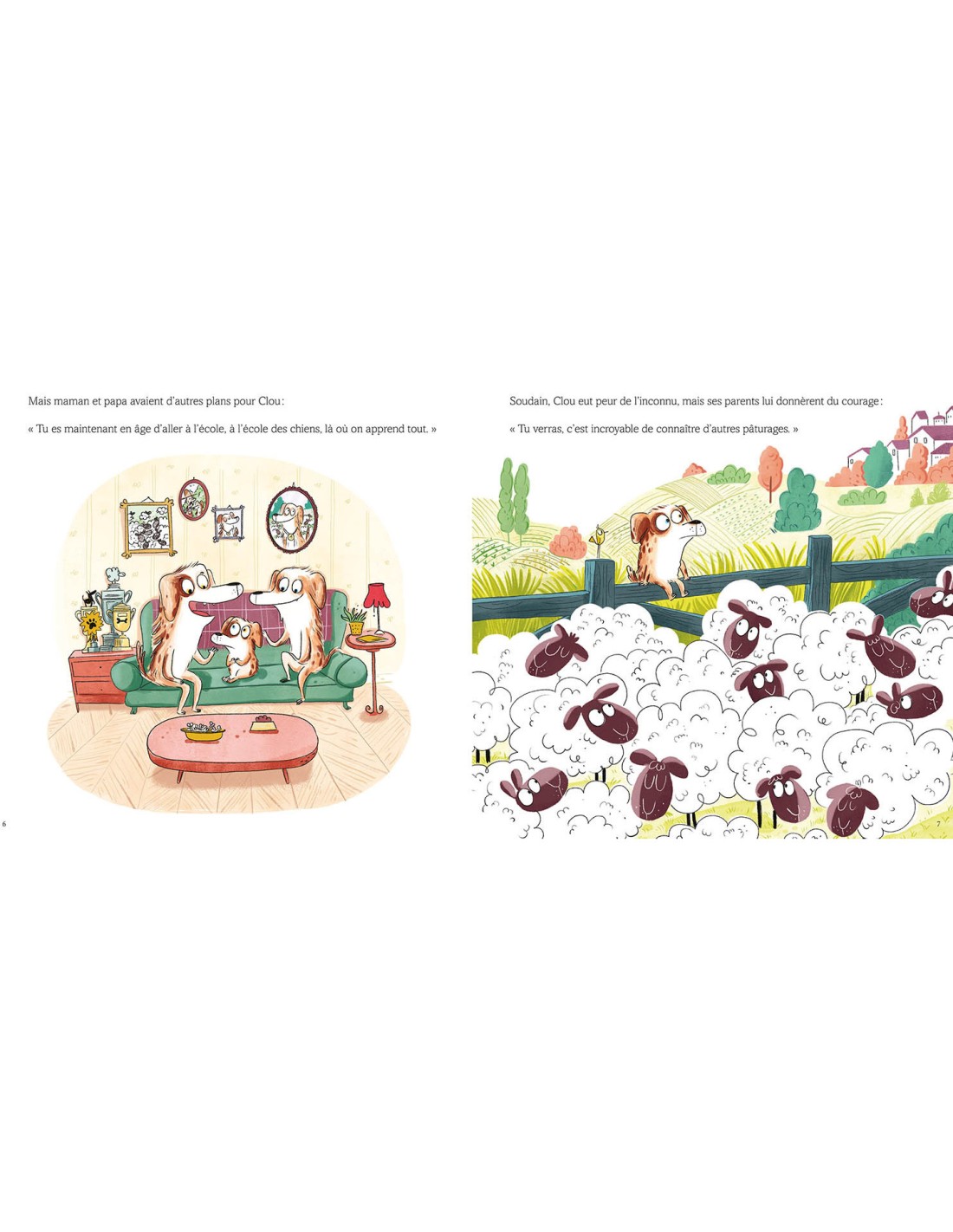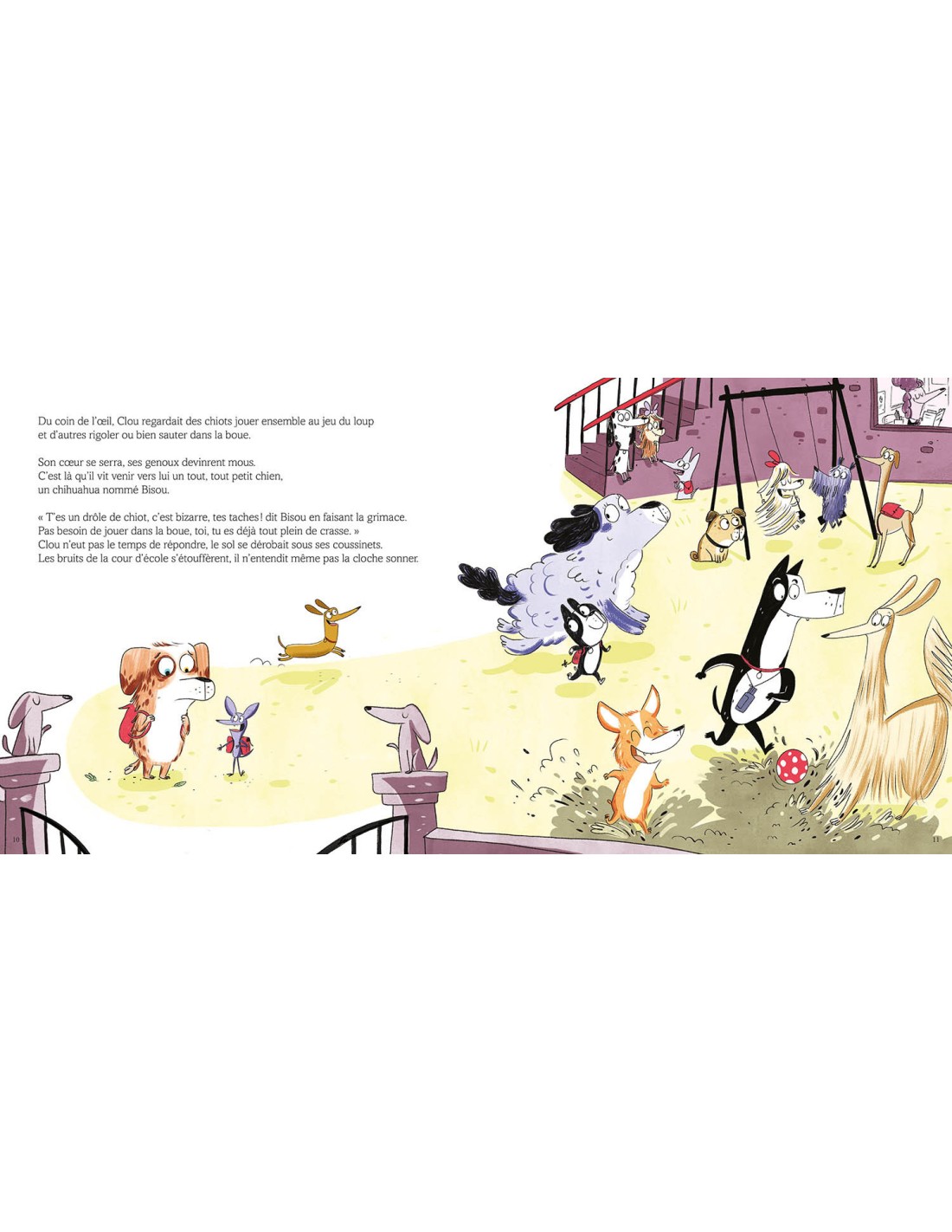 Les autres rigolent et sautent dans la boue. Et voilà que Bisou le chihuaha se moque de ses taches… Heureusement, les parents de Clou ainsi que Madame Truffe, son enseignante, sauront le guider sur le chemin de l’amitié et de la confiance en soi. « Tu es différent, Clou, mais tout le monde l’est.