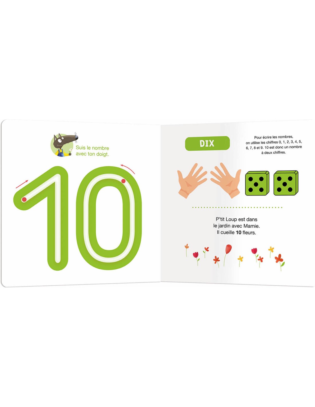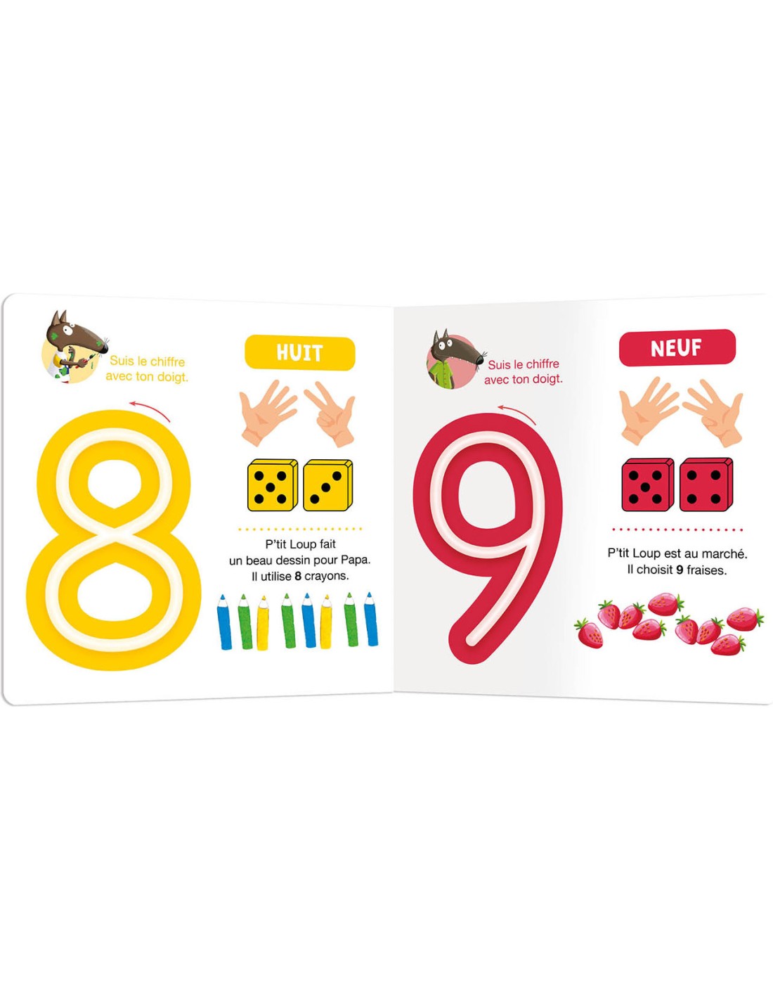Un grand album tout carton pour découvrir les chiffres de 1 à 10 ! Une nouvelle notion pour les tout-petits, à découvrir avec P’tit Loup. Sur chaque page le lecteur découvre un chiffre et toutes les manières de le représenter, ainsi qu’un grand chiffre recouvert de vernis rugueux pour que l’enfant puisse suivre le tracé avec son doigt et ainsi appréhender le geste d’écriture.