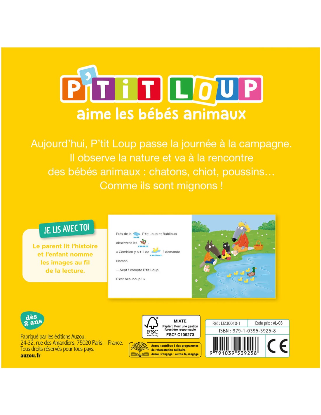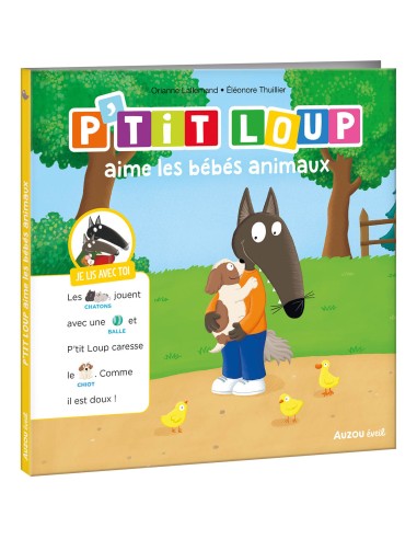 P’tit Loup est à la campagne avec sa famille ! Pour la promenade, ils décident d’aller chez Jack, le voisin, pour voir ses animaux et leurs petits… Chatons, chiot, poussin, caneton : P’tit Loup est émerveillé par tous ces bébés animaux si mignons. Une nouvelle aventure de P’tit Loup avec un système d’histoire à 2 voix : le parent lit l’histoire et l’enfant peut dire les mots qu’il reconnait grâce aux images qui accompagnent le texte.