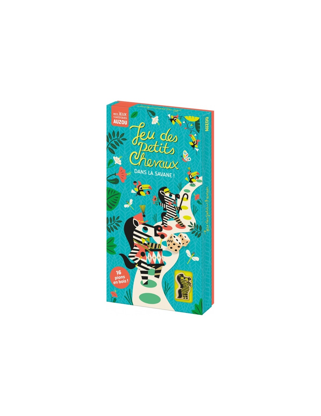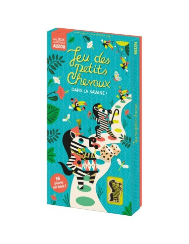 Retrouvez un grand classique chez Auzou : le jeu des petits chevaux mais cette fois-ci dans la savane ! Découvrez ce jeu mondialement connu revisité sous les pinceaux de Amy Blay, et soyez le premier à faire arriver vos zèbres au bout du parcours. En plus de ses 16 beaux pions et ses dés en bois rangés dans un superbe sac en toile, le plateau de jeu recto-verso permet d’avoir deux niveaux !Le jeu classique et aussi un niveau plus facile avec moins de cases, un dé adapté pour des parties plus rapide accessible à partir de 3 ans !- Dimensions : L 170 mm, H 330 mm