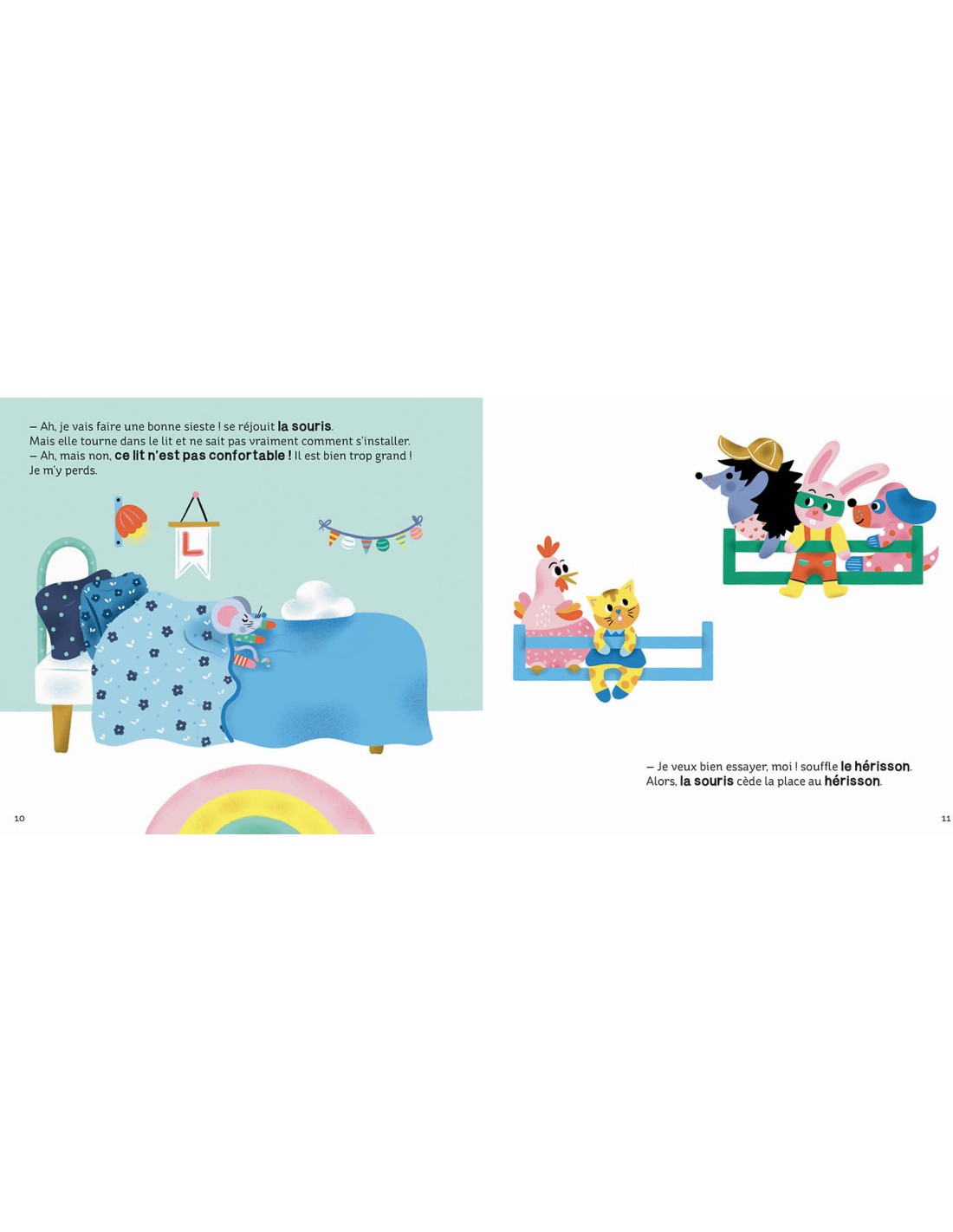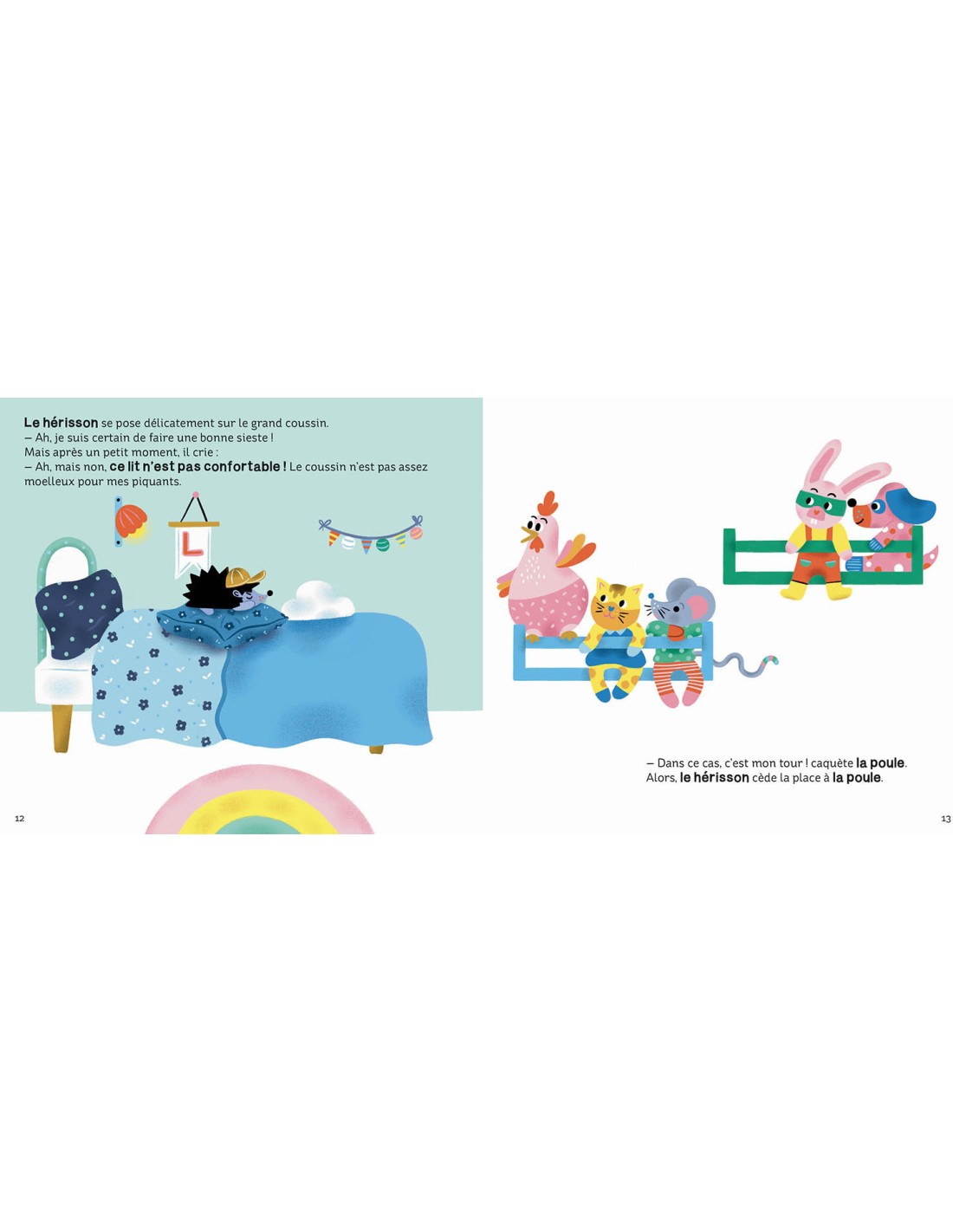Lilou a un nouveau lit. Elle grandit ! En son absence, ses doudous, alignés sur l’étagère, vont essayer tour à tour ce drôle de lit. Aïe ! Ça pique ! La couverture est lourde ! Le matelas est trop mou ! Bref, il y a toujours quelque chose. Jusqu’au soir venu, où Lilou s’installe avec eux : le lit est parfait finalement !
