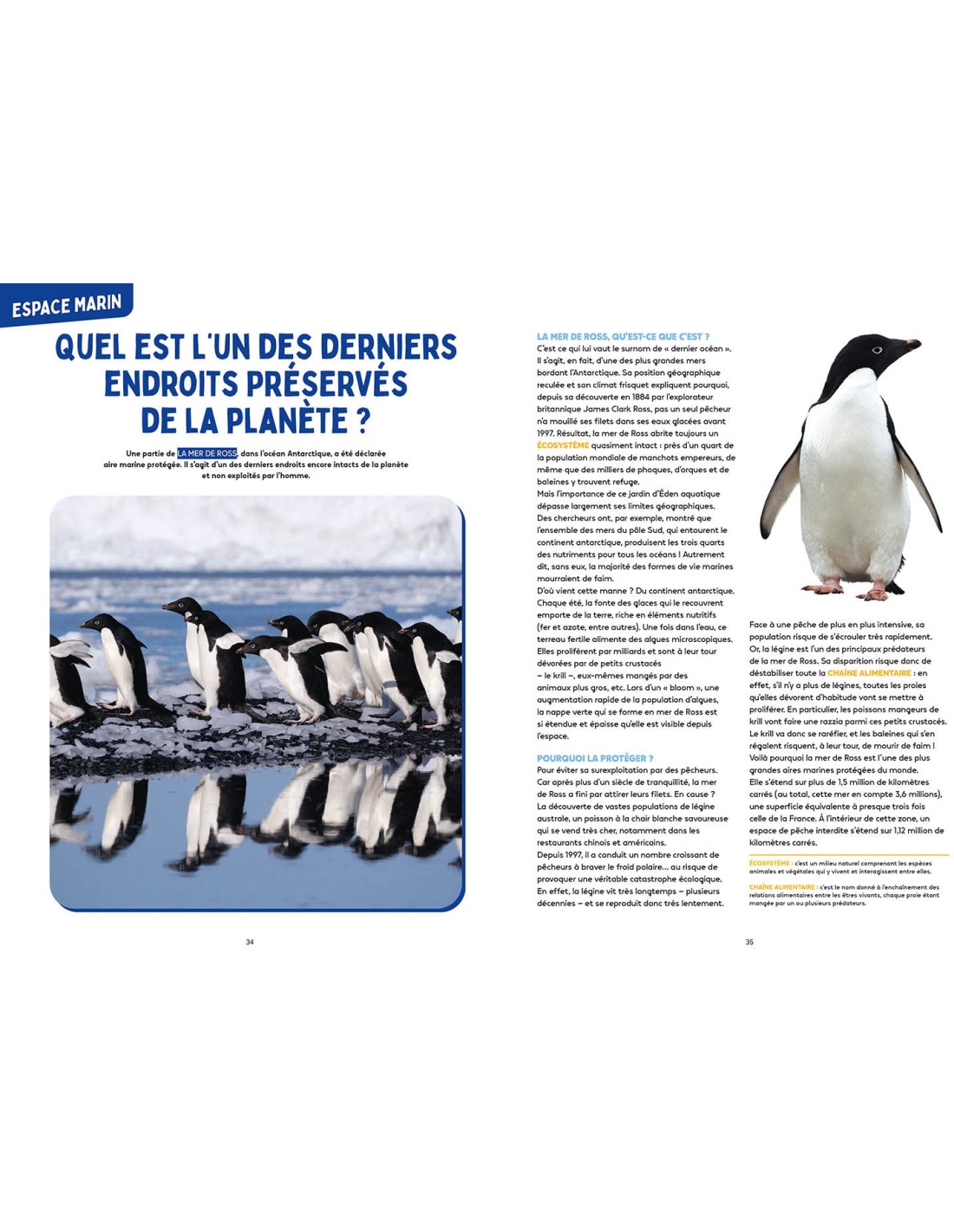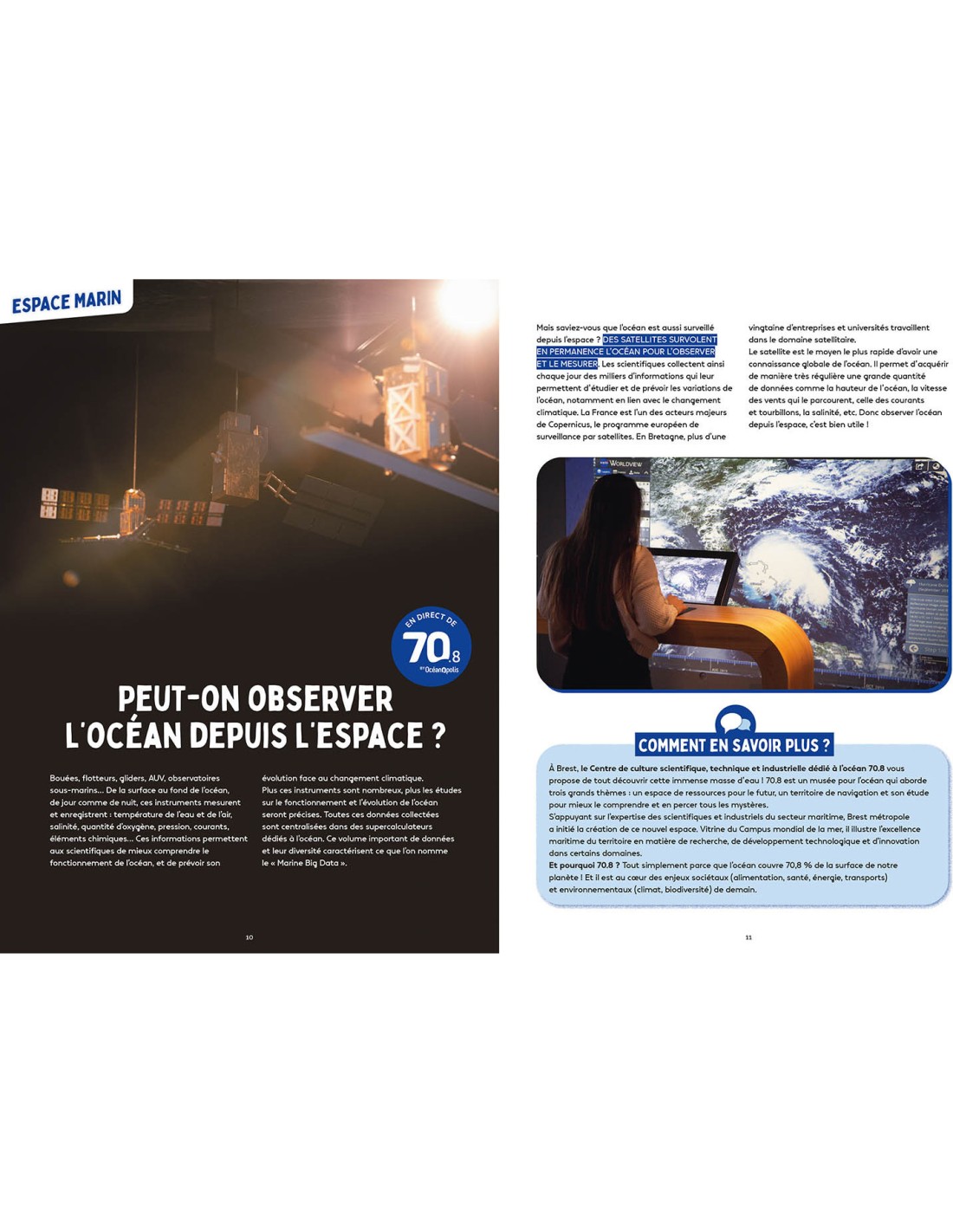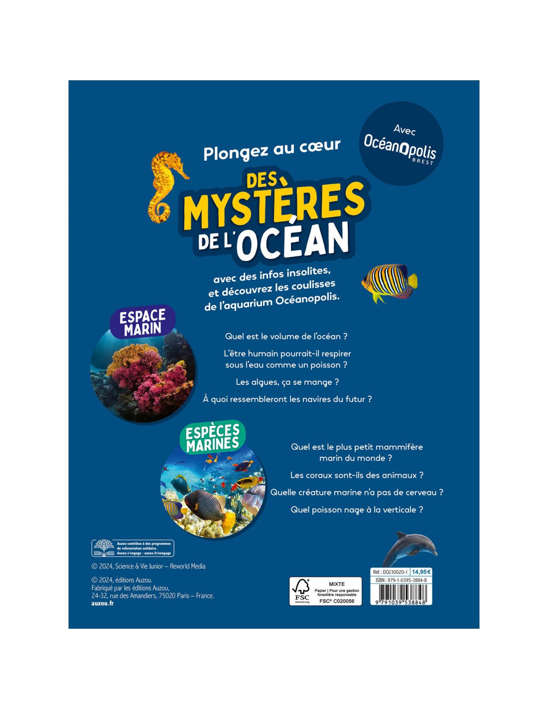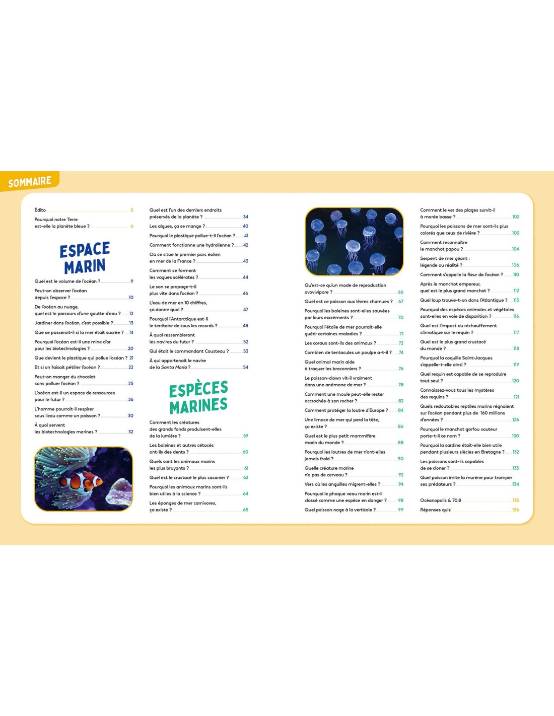 Quel est le volume de l’océan ? L’être humain pourrait-il respirer sous l’eau comme un poisson ? Les algues, ça se mange ? À quoi ressembleront les navires du futur ? Quel est le plus petit mammifère marin du monde ? Les coraux sont-ils des animaux ? Quelle créature marine n’a pas de cerveau ?