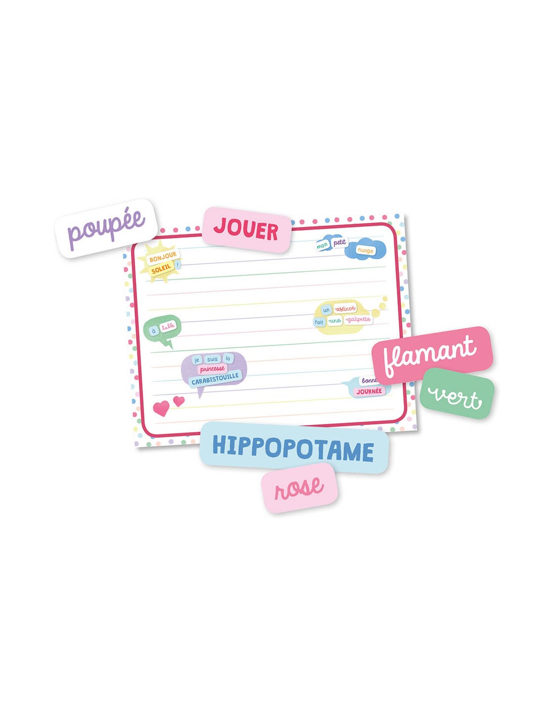 Une pochette qui contient plus de 300 aimants pour créer et imaginer plein de phrases plus amusantes les unes que les autres ! Elle permet également d’'enrichir le vocabulaire de l’enfant. Ces aimants s'’accompagnent d'’un poster rigolo.