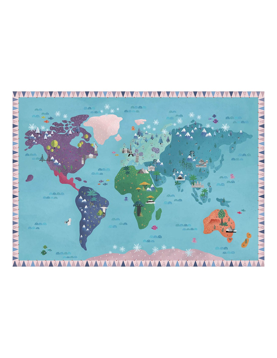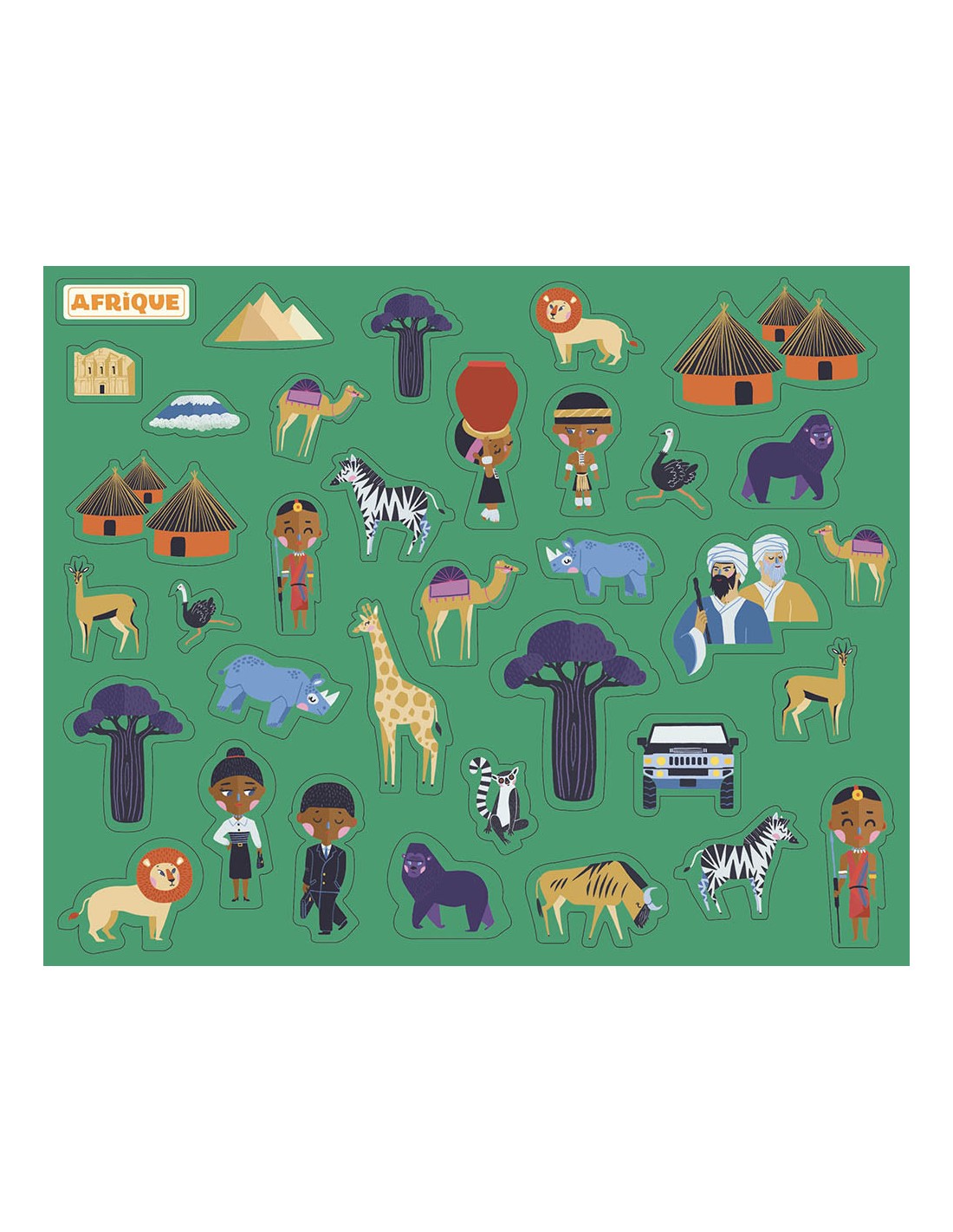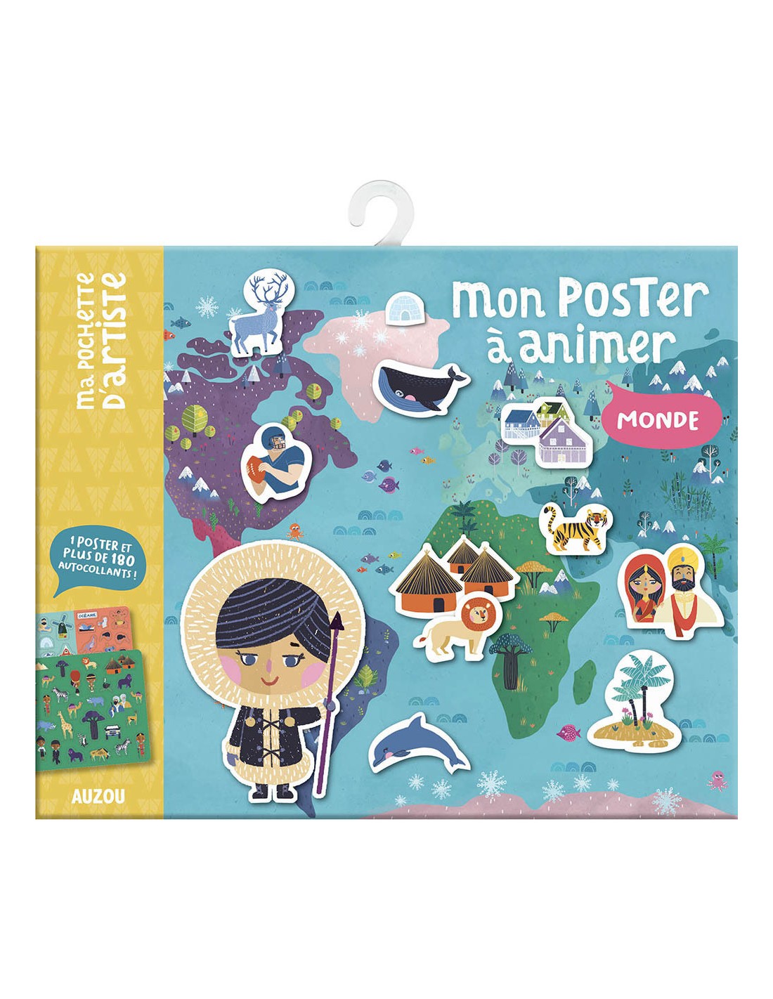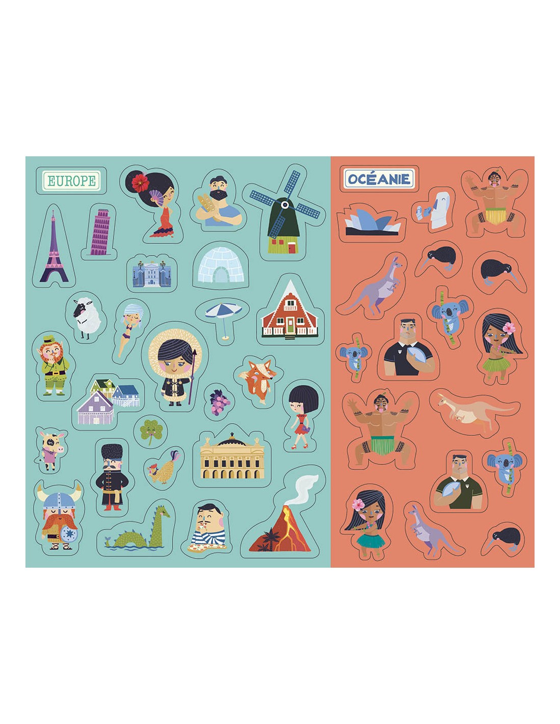 On trouve dans cette pochette un grand poster du monde et ses 180 autocollants à placer sur les différents continents grâce au code couleur.