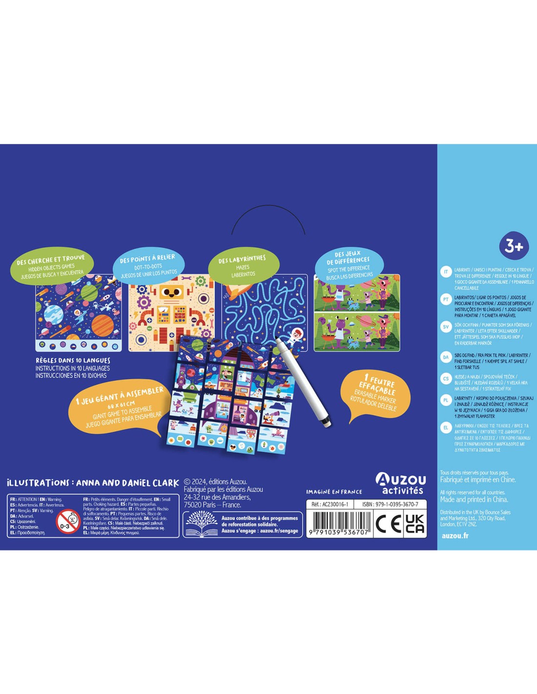 Une pochette de jeux sur le thème de l'espace à partir de 3 ans ! Au recto des cartes, amuse-toi avec des labyrinthes, des points à relier, des cherche et trouve, des différences… Rassemble ensuite les cartes côté verso pour reconstituer un cherche et trouve géant ! 20 jeux plastifiés à faire et à refaire !