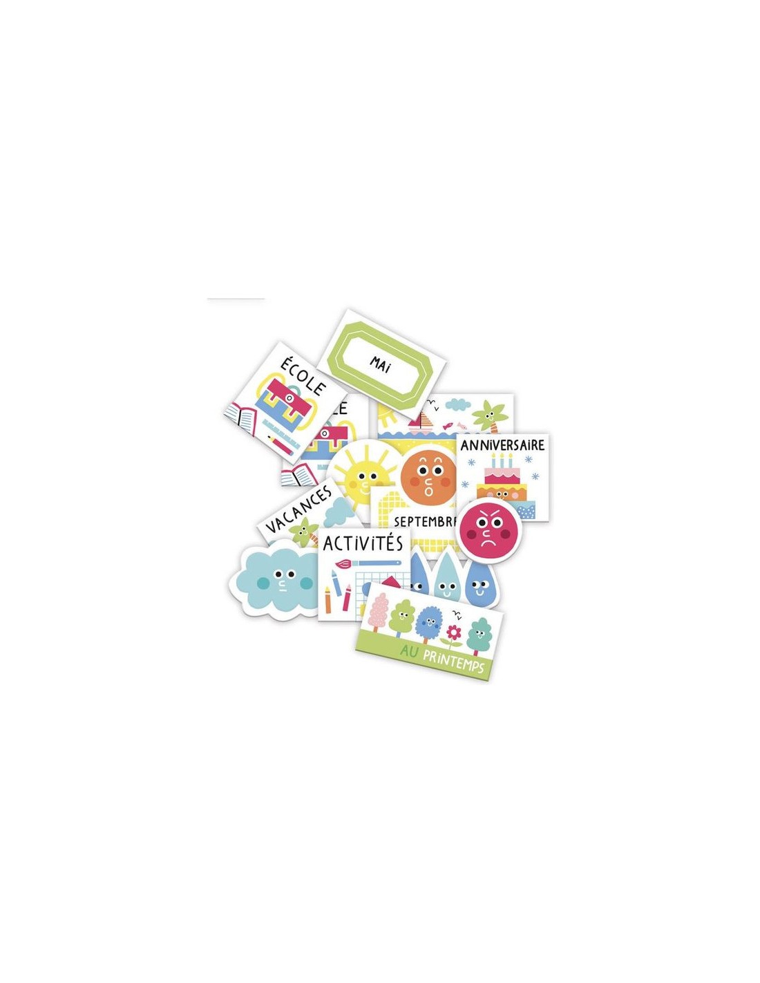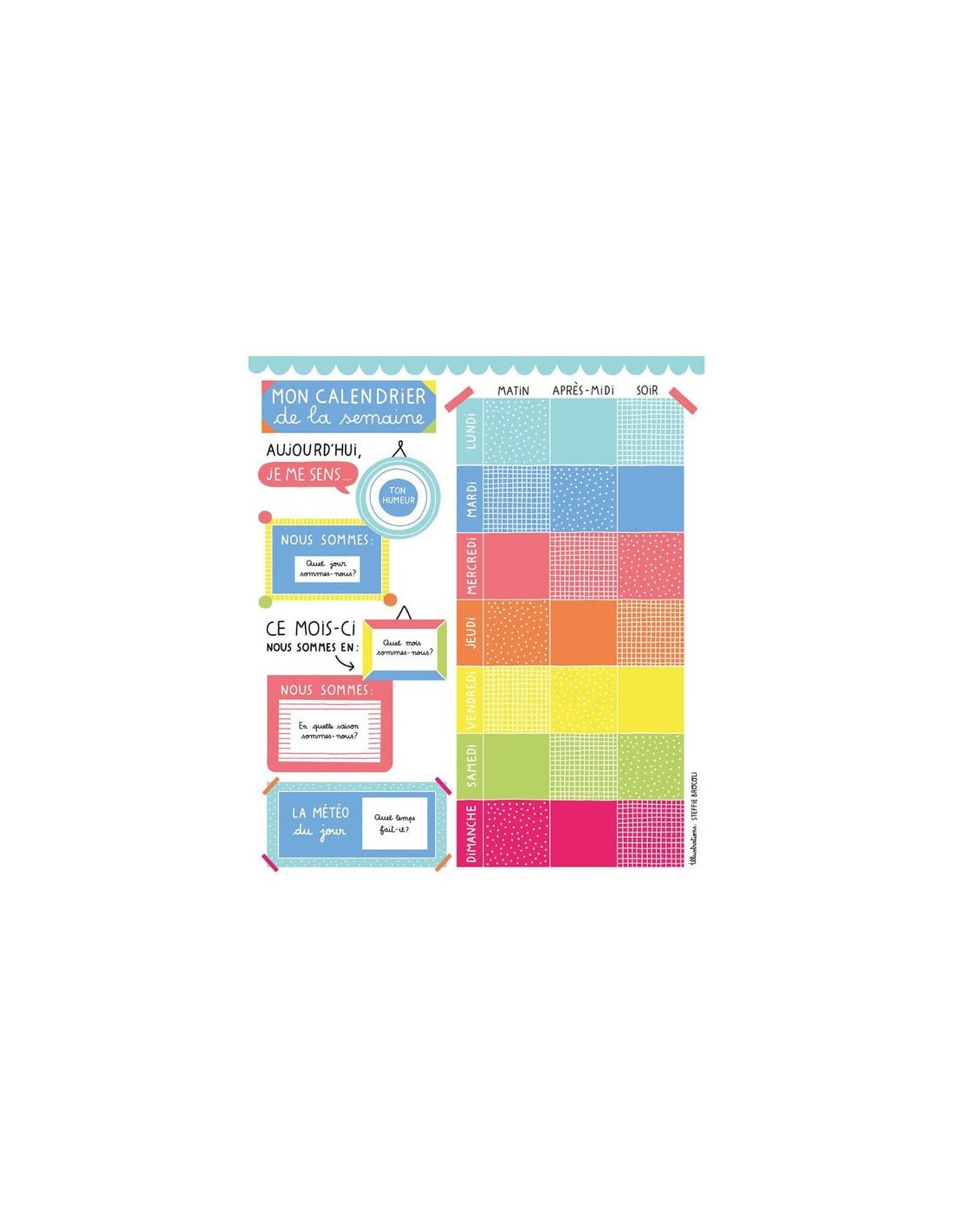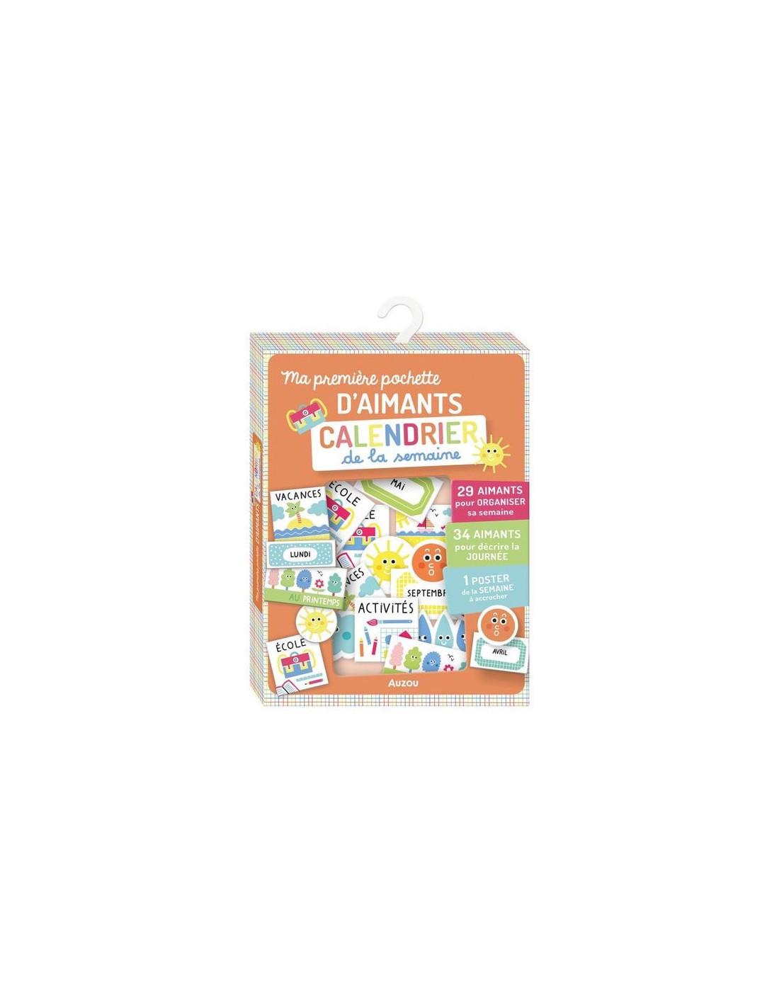 Une pochette avec plus de 50 aimants et un grand poster-calendrier pour organiser la semaine et apprendre les jours, les mois, le temps qu'il fait, les émotions…