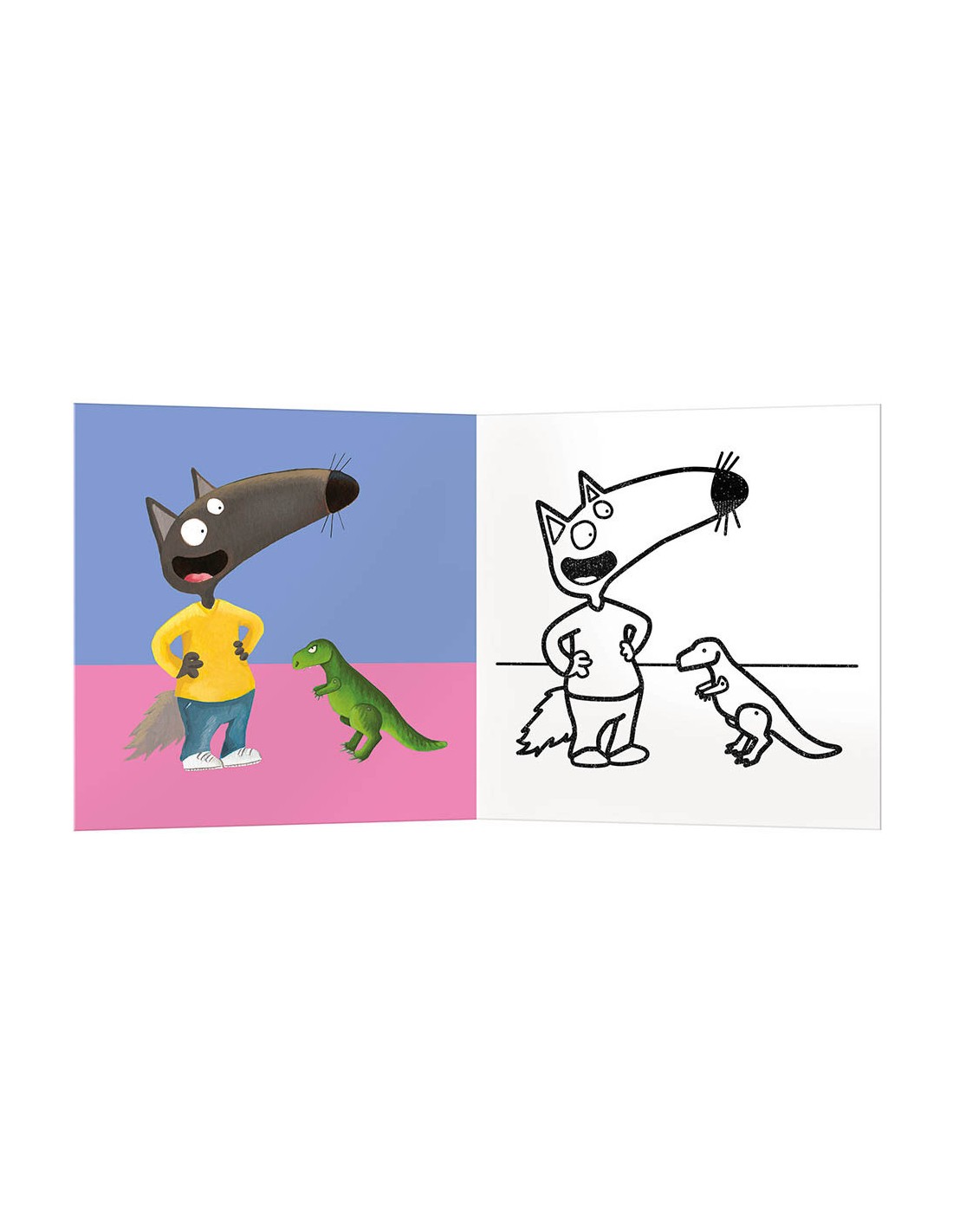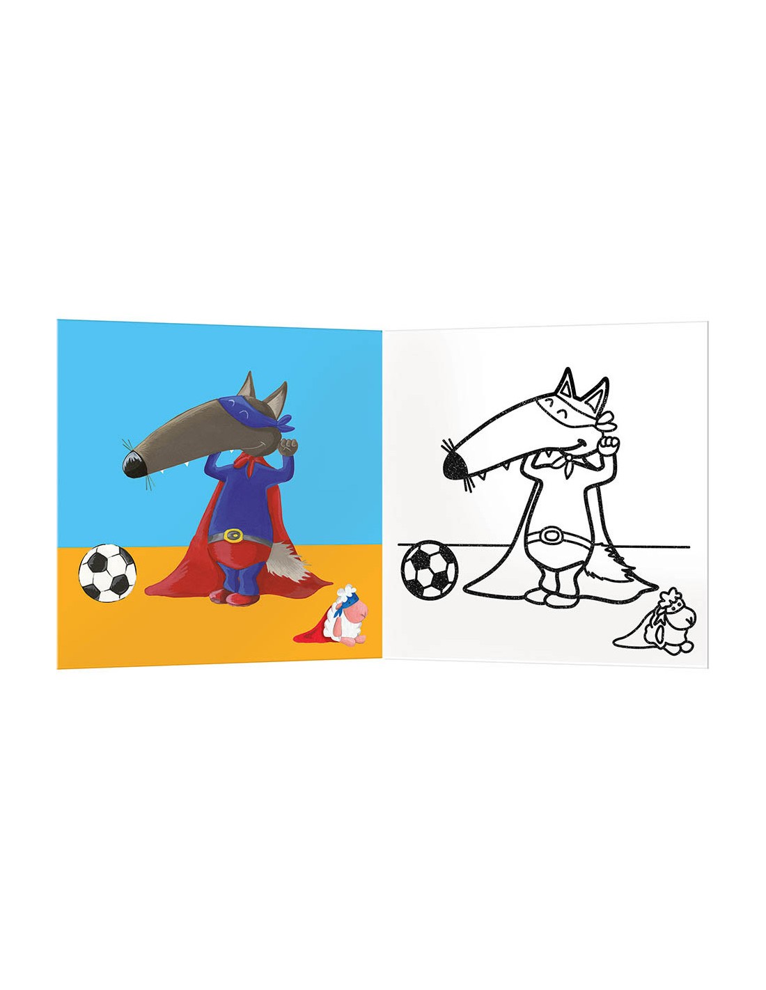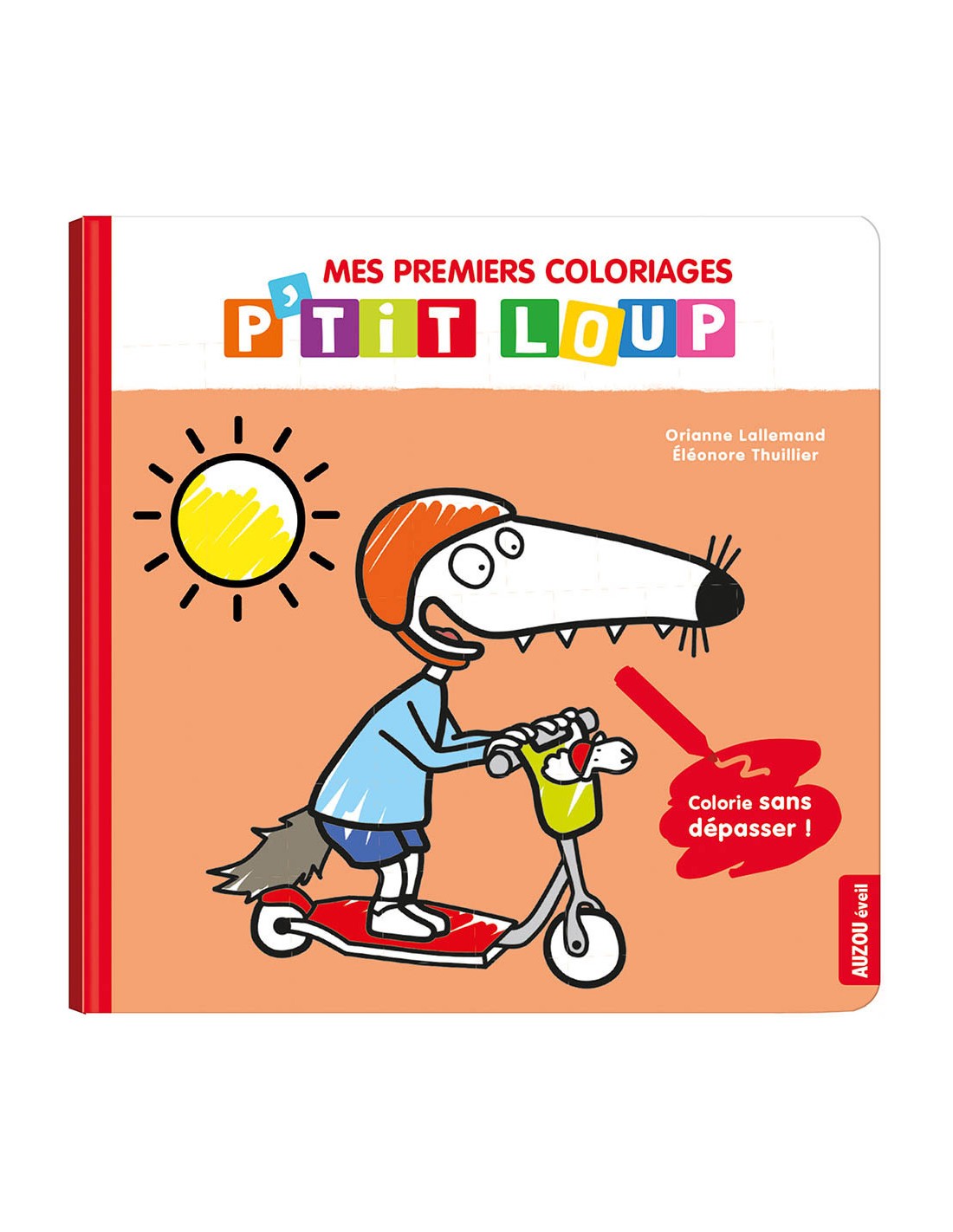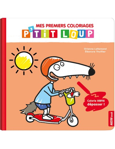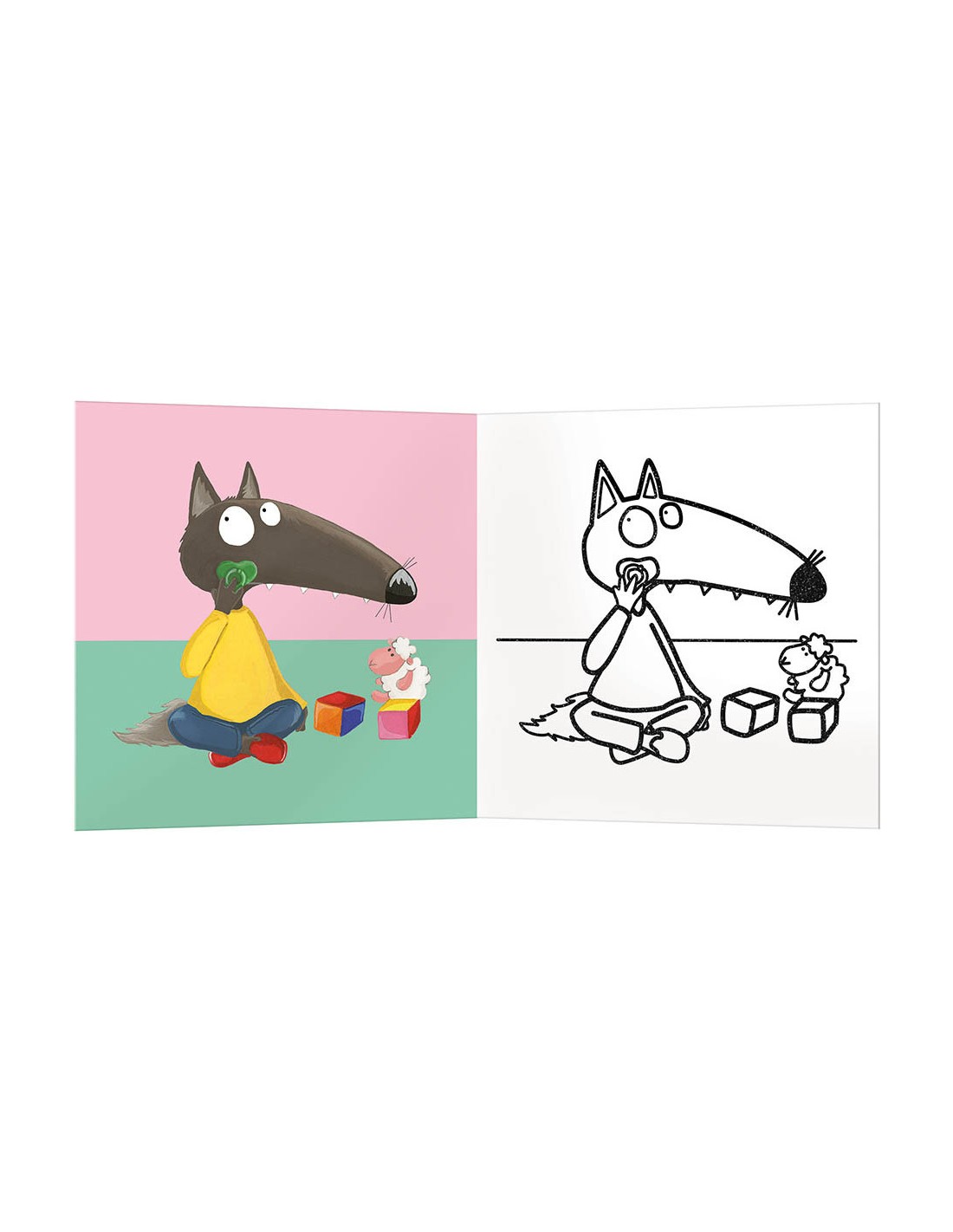 Sur chaque double page, l'enfant doit colorier une illustration simple de P'tit Loup avec ses jouets : trottinette, cerf-volant, robot, doudou,... Les contours avec du vernis pailleté permettent à l'enfant de colorier sans dépasser.