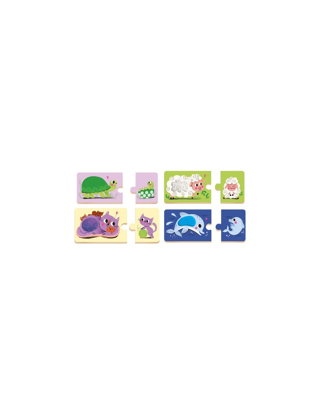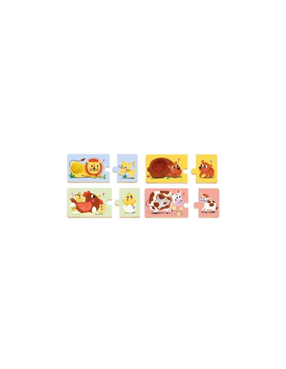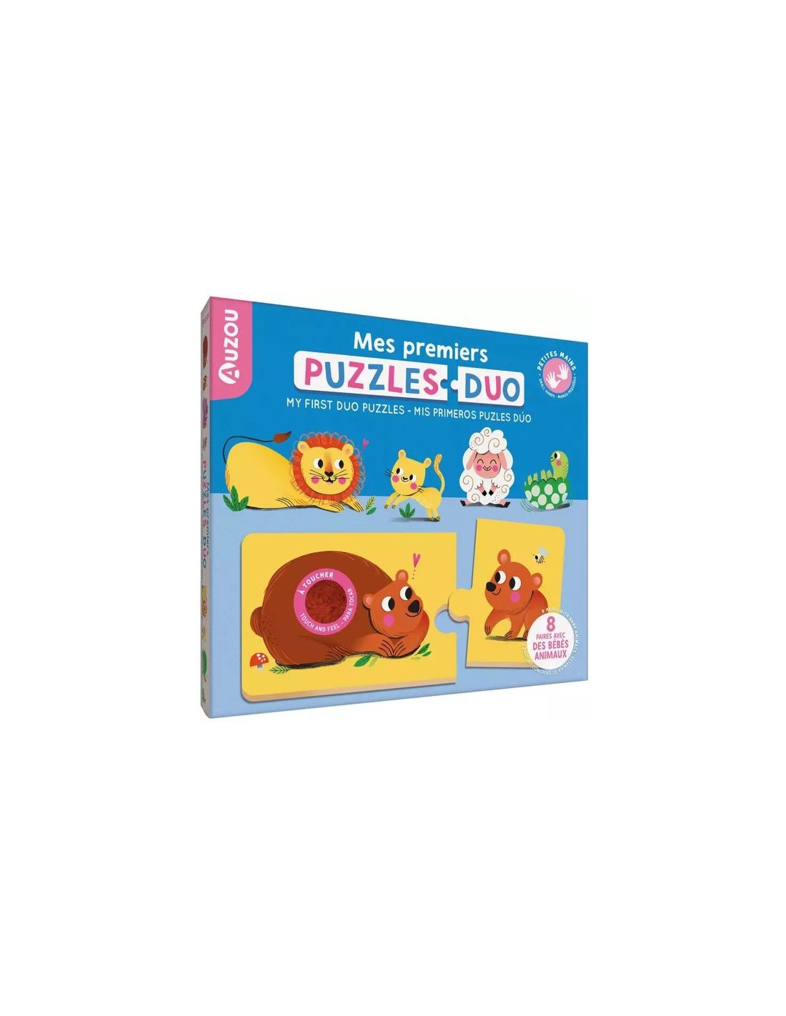 8 puzzles de 2 pièces : l'enfant associe un animal adulte avec son bébé. Les puzzles duo proposent 8 matières à toucher pour éveiller les sens du petit. Une activité qui favorise la motricité, la patience et l’éveil sensoriel.