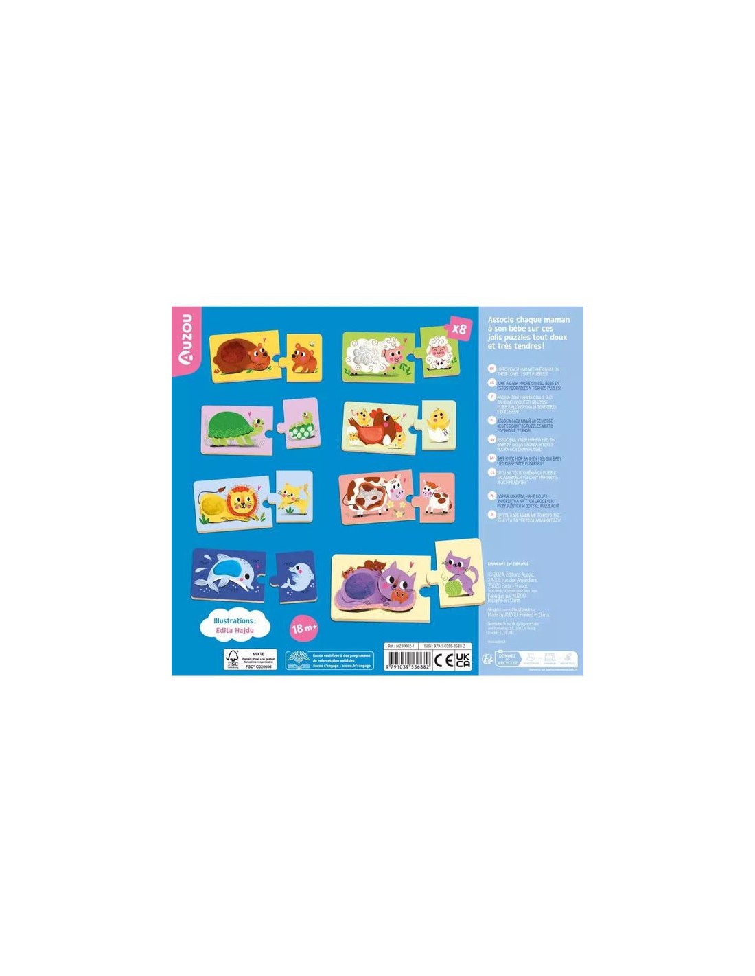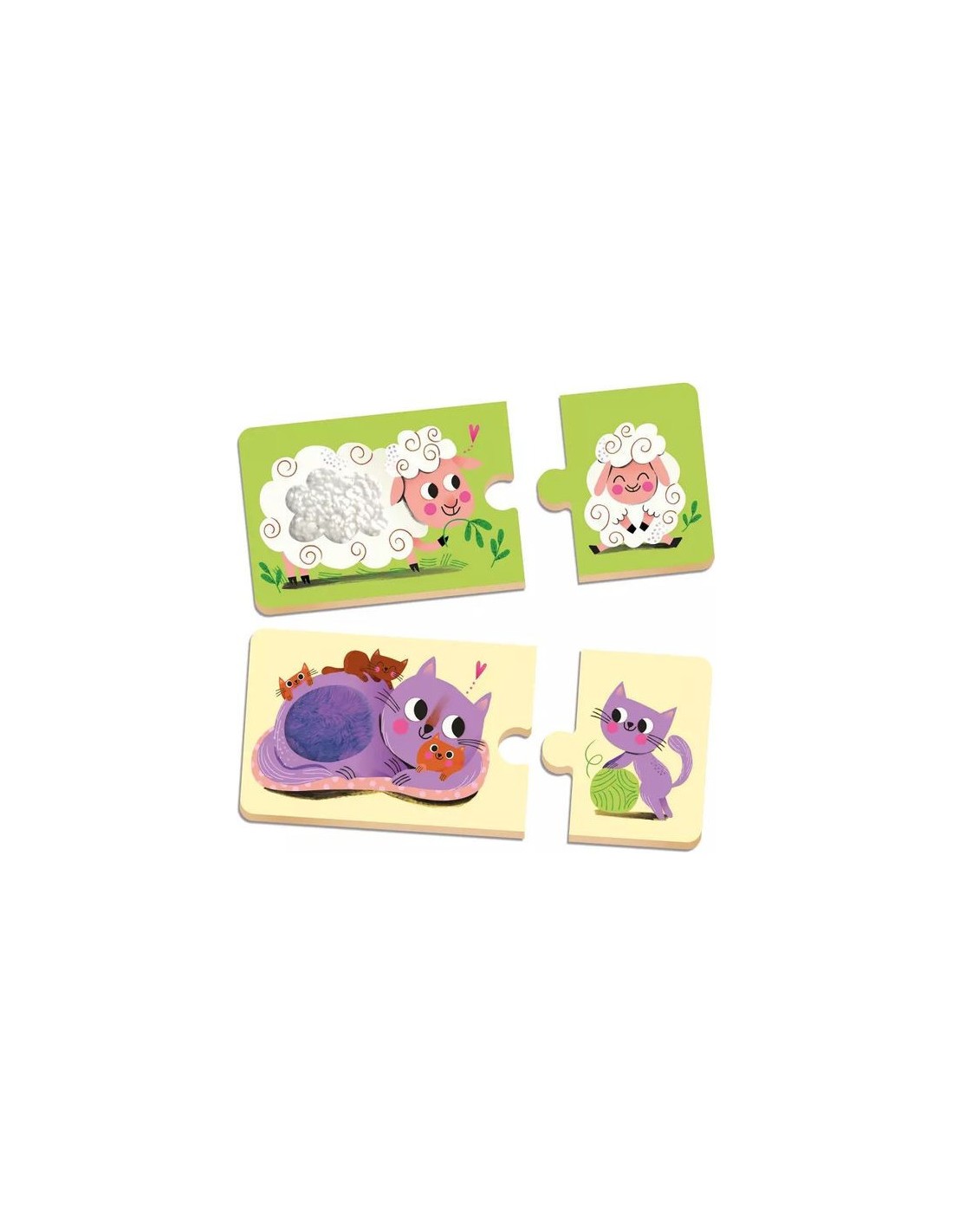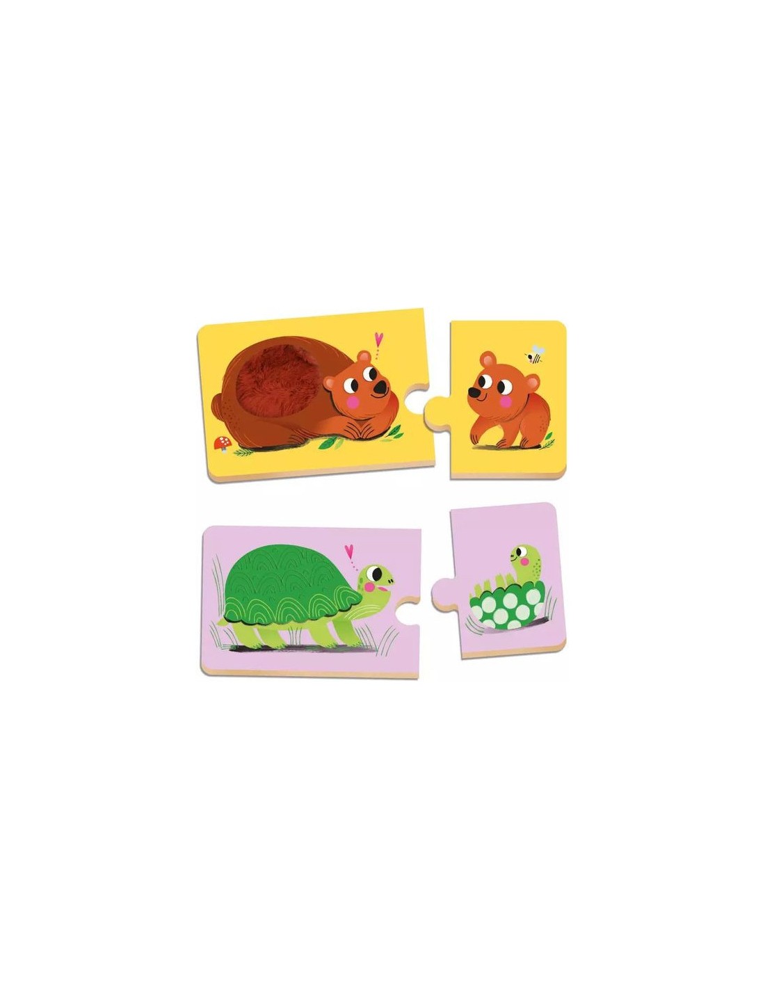 8 puzzles de 2 pièces : l'enfant associe un animal adulte avec son bébé. Les puzzles duo proposent 8 matières à toucher pour éveiller les sens du petit. Une activité qui favorise la motricité, la patience et l’éveil sensoriel.