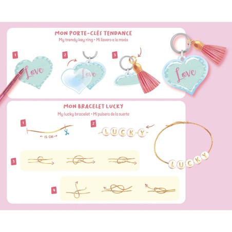 Découvre dans ce coffret de quoi réaliser 4 objets porte-bonheur aux couleurs scintillantes: - Une fiole magique avec un charm trèfle à 4 feuilles à poser sur ton bureau - Un attrape-rêves doré et coloré à accrocher au-dessus de ton lit - Un bracelet avec des perles lettre dorées "Lucky" pour te porter chance tous les jours - Un porte-clé grigri pailleté à emmener partout