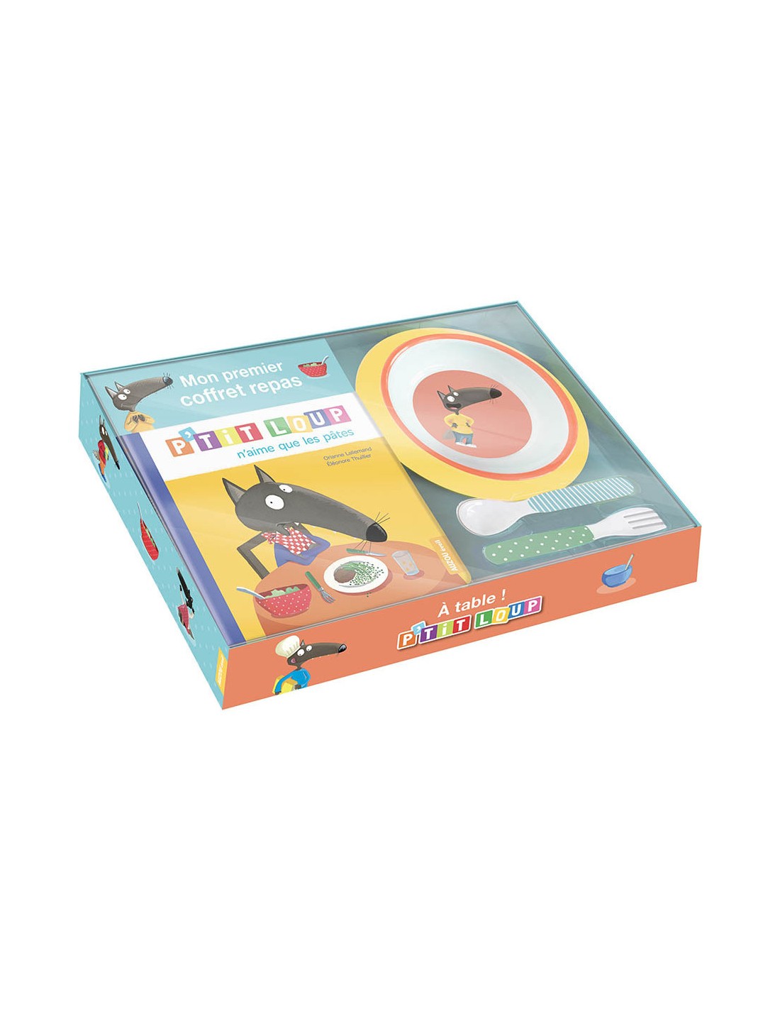 Un coffret composé d'un album de P'tit Loup et d'un joli set repas (un bol, une assiette et deux couverts), pour commencer à manger tout seul !