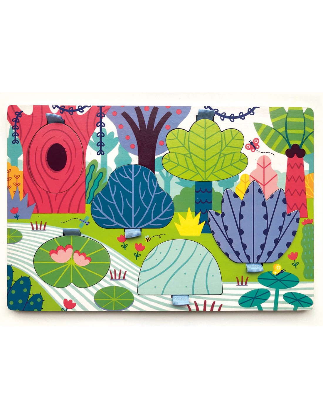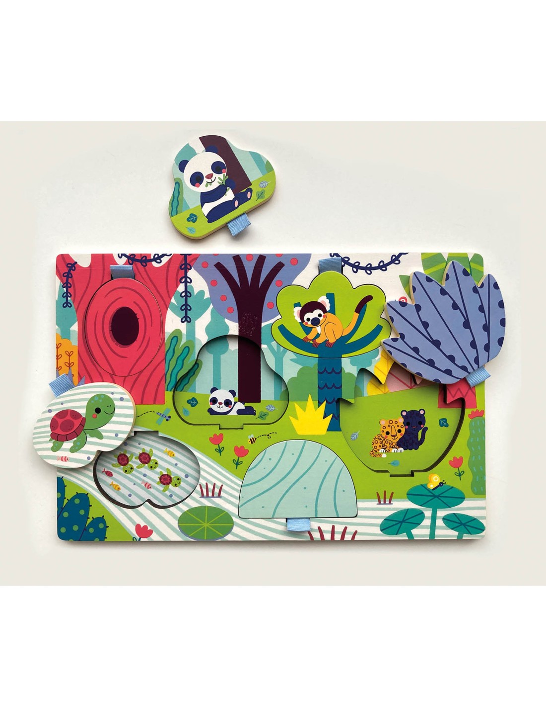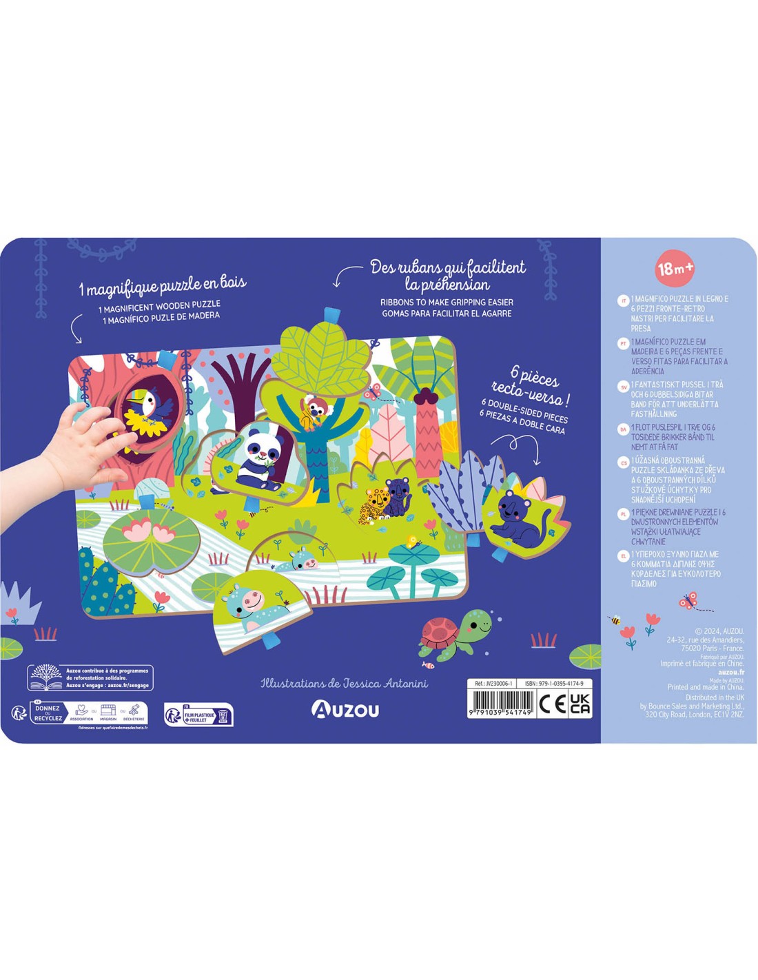 Grâce à 6 belles pièces du puzzle en bois, l’enfant réunit parents et enfants. La poignée en tissu favorise une prise en main facilitée.