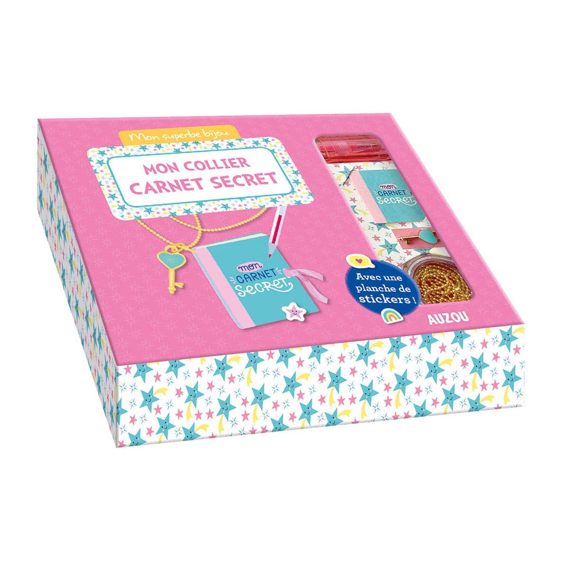Une nouveauté dans la collection Mon superbe bijou ! De quoi confectionner un super carnet secret : trois couvertures au choix, des pages intérieures à monter, des stickers pour le décorer et un stylo pour y écrire tous ses secrets. Le carnet se place ensuite comme pendentif d’un collier, pour pouvoir emporter ses secrets partout avec soi.