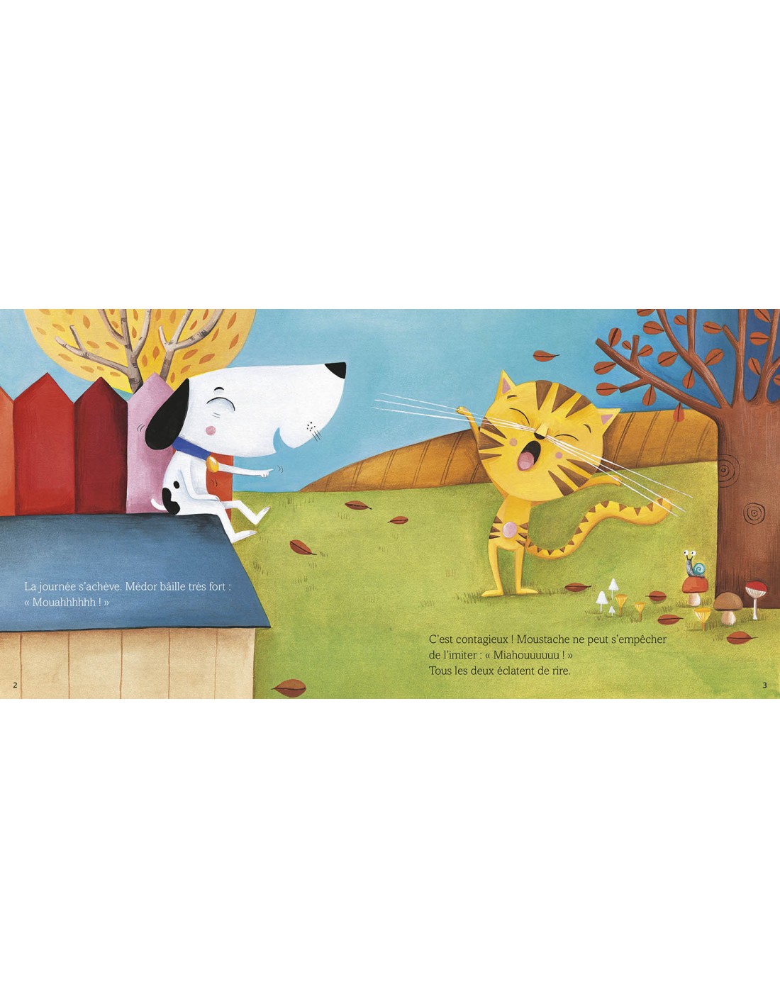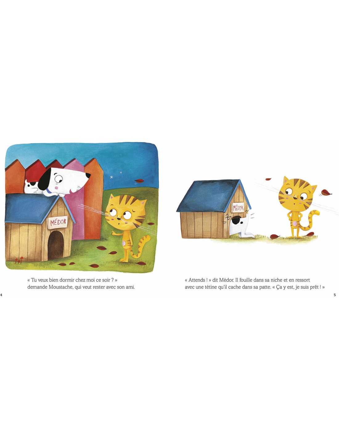Moustache invite Médor à dormir chez lui, mais pendant la nuit, Moustache voit des ombres effrayantes, il a peur… Qu’est-ce donc que cette petite lumière verte qui brille près de Médor ? Heureusement Médor a apporté la solution !