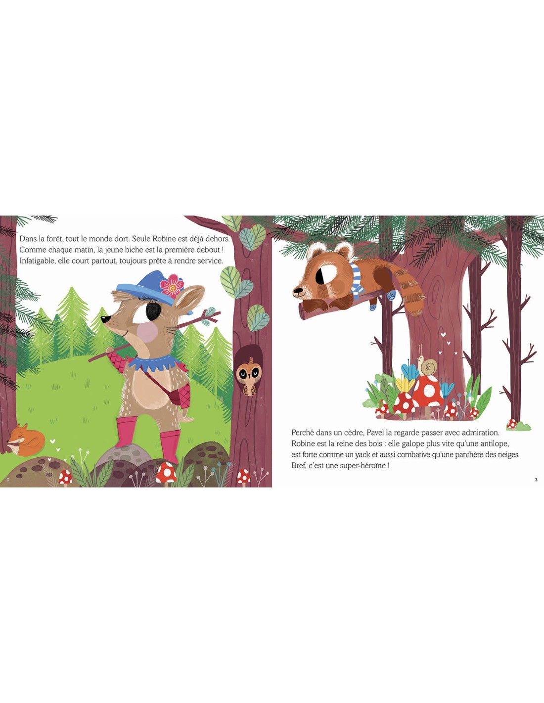 Dans la forêt, tout le monde dort. Seule Robine est déjà dehors. Comme chaque matin, la jeune biche est la première debout ! Infatigable, elle court partout, toujours prête à rendre service. Bref, c'est une super-héroïne!