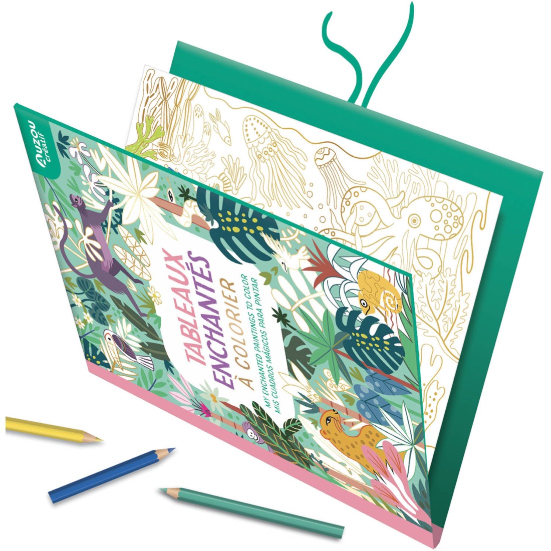 Mon cahier créa Coloriage enchantés contient 15 magnifiques coloriages à détacher et à conserver ou offrir. 5 d’entre eux sont toute en brillance ! Une fois détachés, les coloriages peuvent être conservés dans leur magnifique carton à dessin avec son dos toilé, qui se ferme par un ruban. Le carton à dessin propose également 100 autocollants pour customiser ses créations !