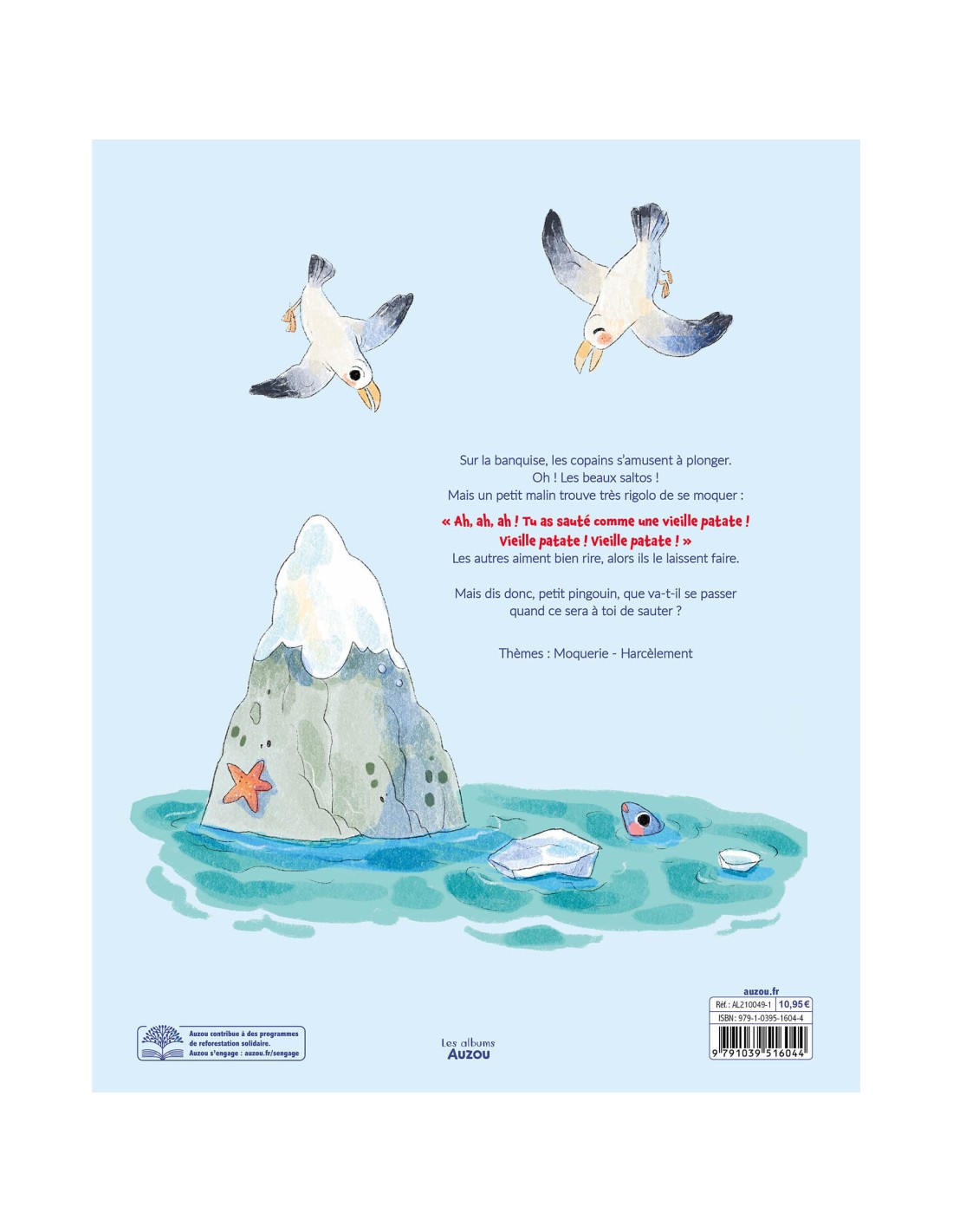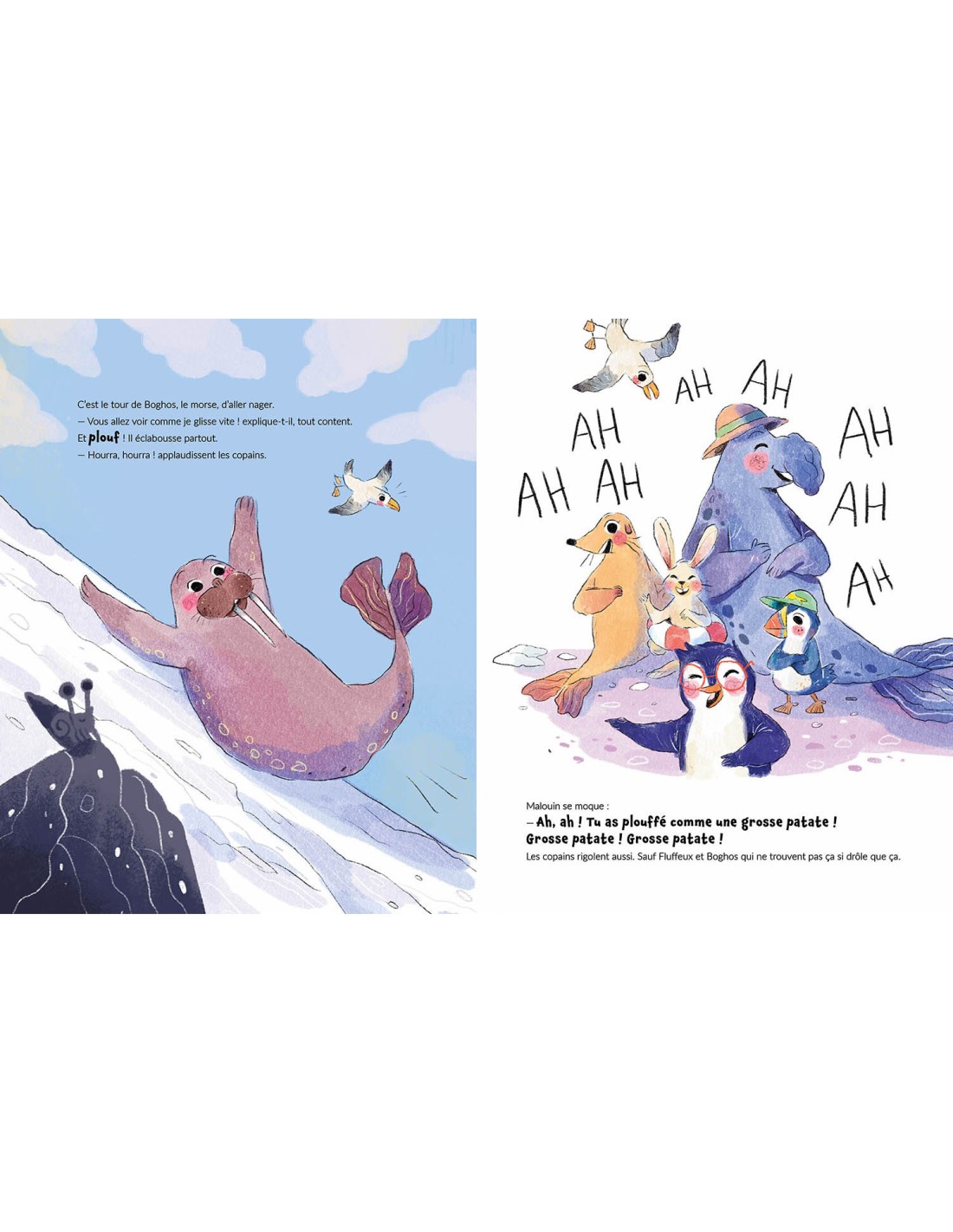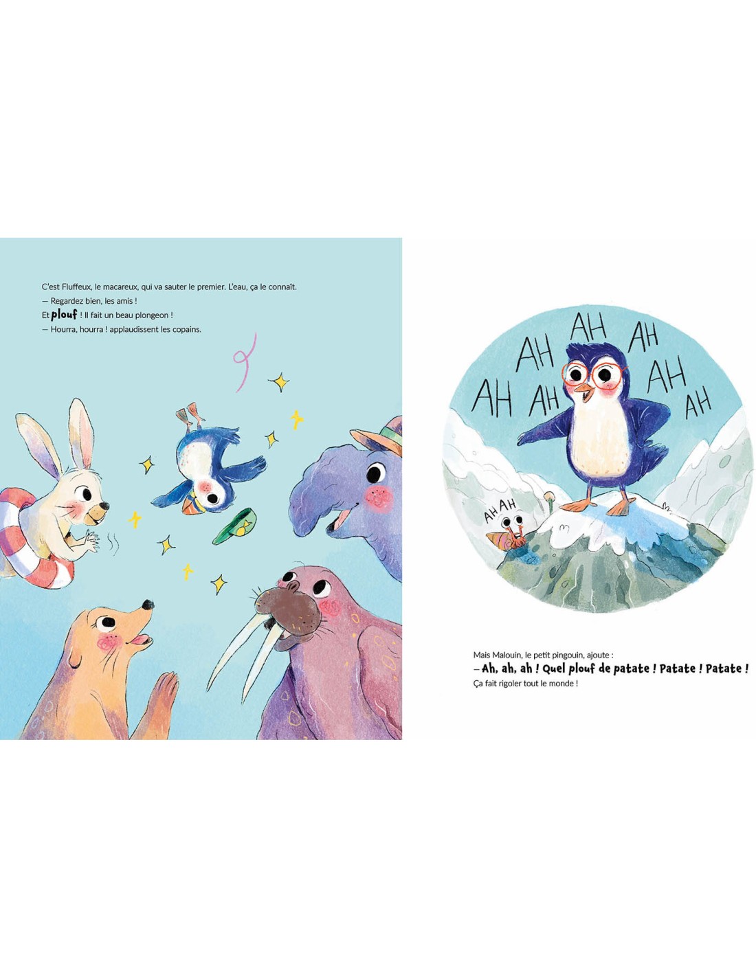 Un concours de plongeon s'organise sur la banquise. Tous les animaux sautent les uns après les autres, en faisant de magnifiques pirouettes ! Mais Malouin le pingouin n'arrête pas de se moquer et de les appeler "vieille patate". Ça suffit, maintenant !