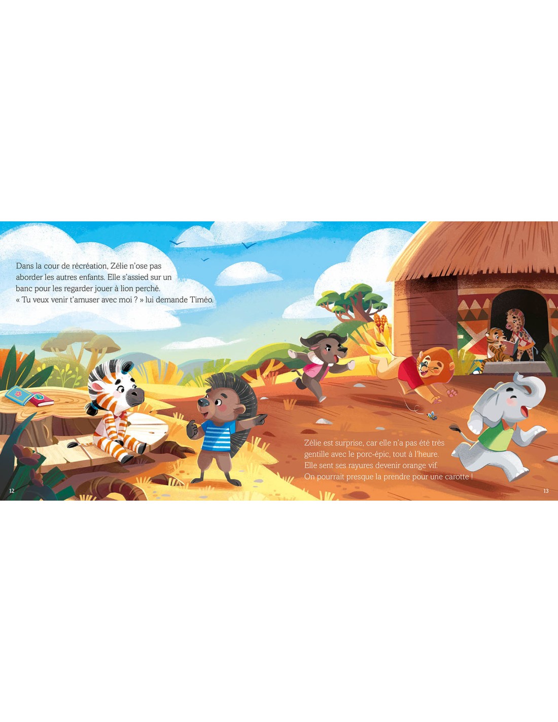 Aujourd’hui, c’est la rentrée et Zélie est très heureuse de retourner à l’école. Mais quand il faut quitter sa maman, la tristesse l’envahit. Puis la fierté, la colère la honte ou le plaisir vont faire irruption dans sa journée. Et pas facile de le cacher car à chaque émotion les rayures de Zélie changent de couleur.