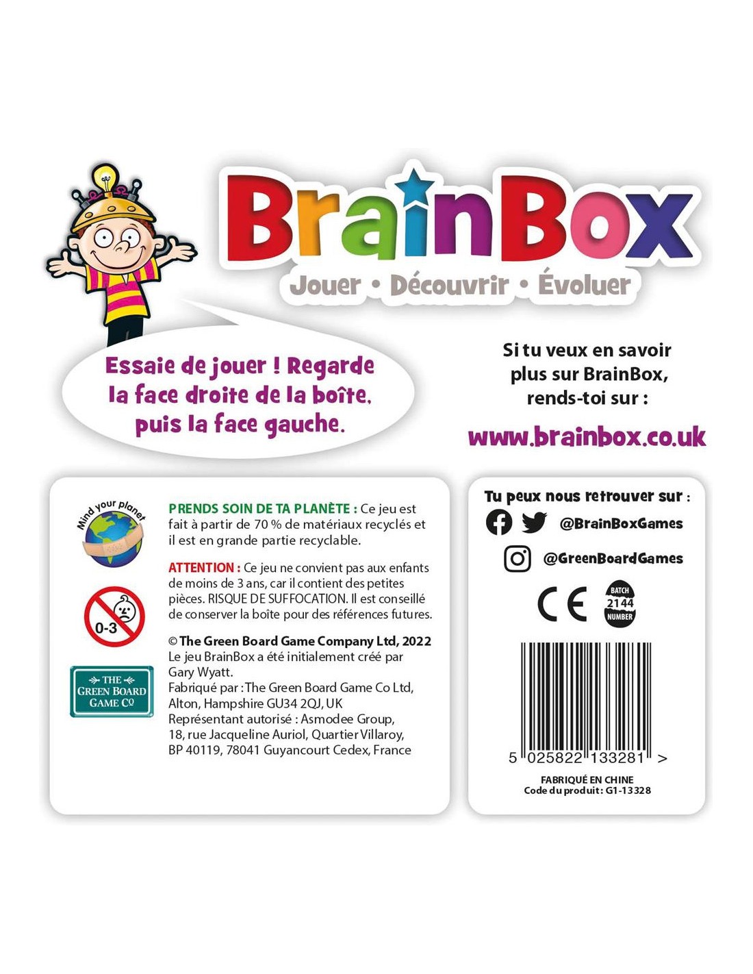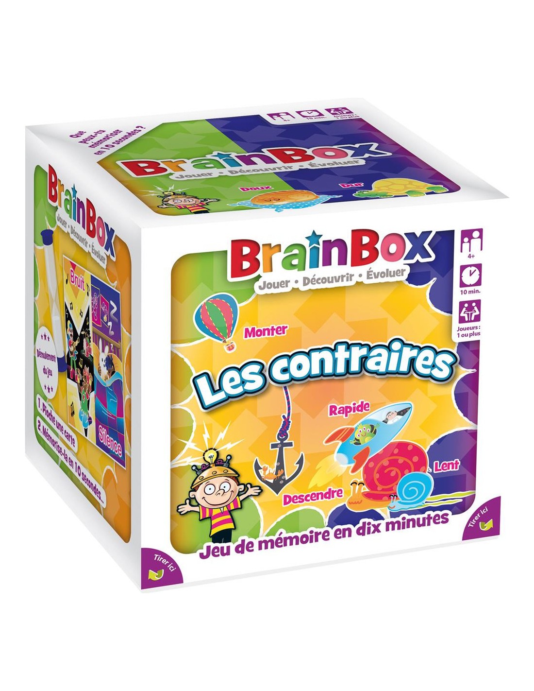 Ce jeu très bien conçu et coloré est parfait pour apprendre aux enfants à respecter les règles d'un jeu de société mais aussi pour leur apprendre la concentration tout en faisant fonctionner leur mémoire. Les enfants observent une carte pendant 10 secondes puis répondent à une question. Si la réponse est bonne la carte est gagnée ! Un jeu d'observation très coloré pour développer la mémoire des tout-petits.La Brainbox les contraires permet aux enfants d'apprendre à différencier des lieux, des concepts et des objets... Grâce à des associations d'images trop mignonnes !