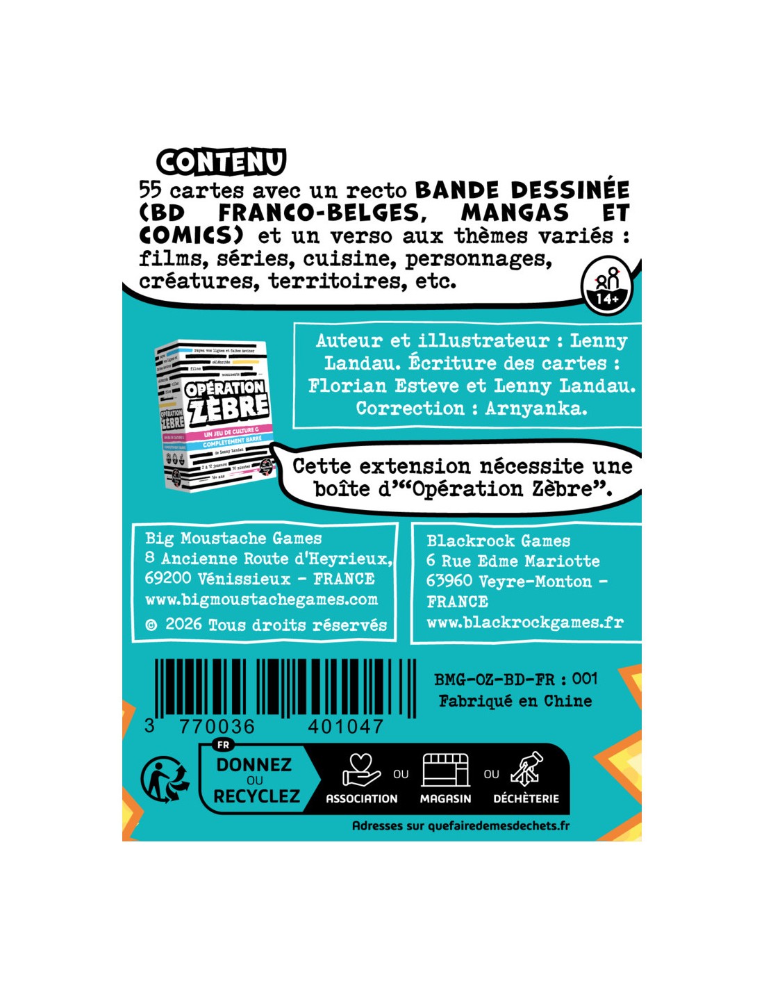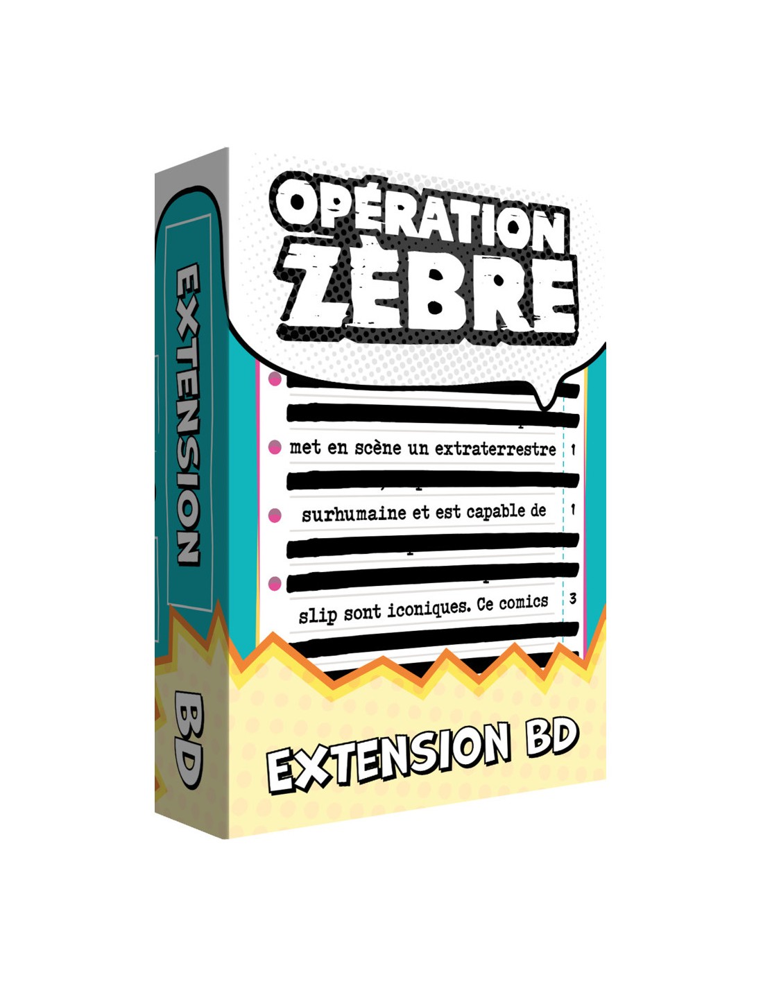 "Opération Zèbre : Extension Bd" est une extension de 55 cartes recto-verso (soit 110 nouvelles cartes à faire deviner) introduisant de nouveaux thèmes,dont la Bande dessinée, à rajouter à votre jeu de base.