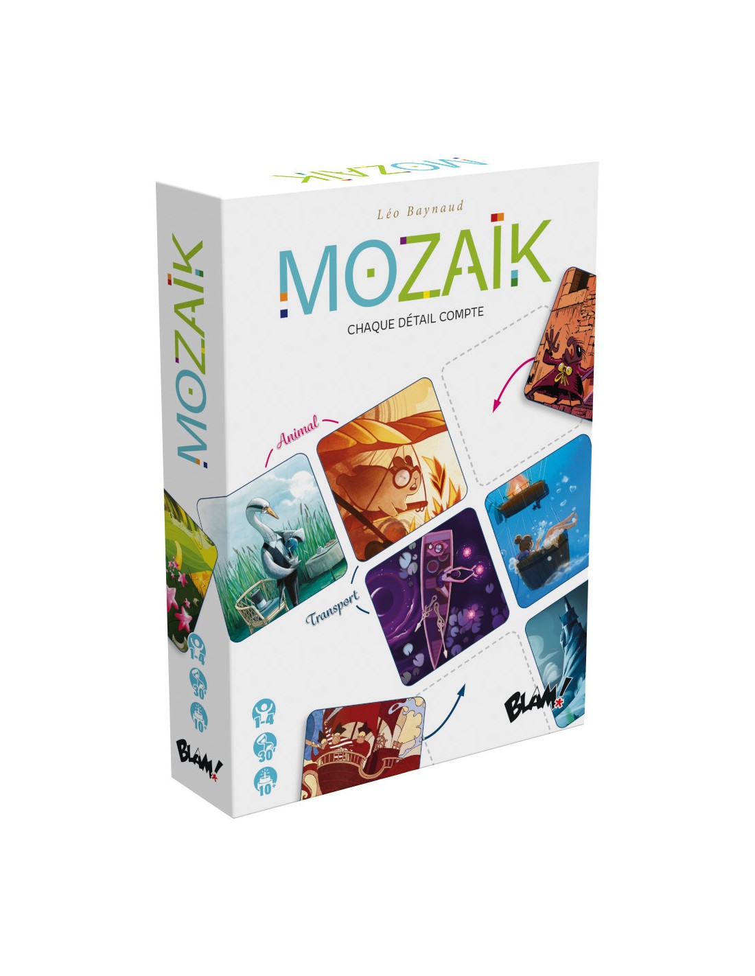 Une partie de Mozaïk se déroule en 9 tours de jeu, au cours desquels vous remplissez votre grille personnelle : un carré de 3x3 images, encadré de mots, placés aux extrémités des lignes et des colonnes. Chaque mot rapporte des points, s'il s’associe avec les images de sa ligne ou colonne.