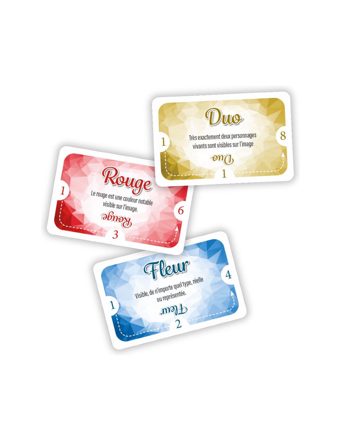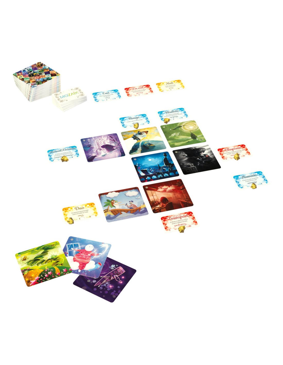 Contenu : - 89 cartes Image, - 52 cartes Mot, - 36 gemmes, 1 Livret de règles