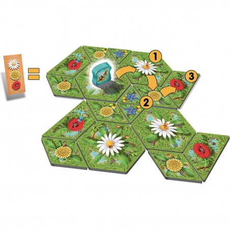 Identifiez les possibilités de parcours qui permettront à l’abeille de réaliser ces combinaisons en se déplaçant uniquement sur les fleurs qui sont dans son voisinage immédiat. Mais attention, tous les joueurs jouent avec le même pion Abeille. À vous d’anticiper leurs choix !