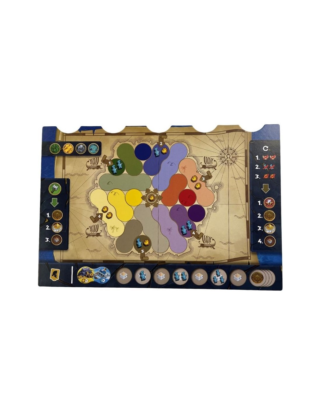 À votre tour, vous choisissez une des cartes Action disponibles. Elle vous donne une tuile Terrain, à poser sur votre plateau pour symboliser l'exploration de l'île. Son positionnement permet aussi de préparer vos futurs constructions et d'attirer l'attention des Titans.Puis vous effectuez l'Action de la carte choisie. Vous pourrez capturer les Créatures peuplant votre île. Recruter des Hoplites sera indispensable pour combattre. Produire de l’Orichalque nécessaire si vous voulez forger des médaillons. Enfin, Construire vous ouvrira la porte de nouvelles stratégies grâce à de puissants Bâtiments.
