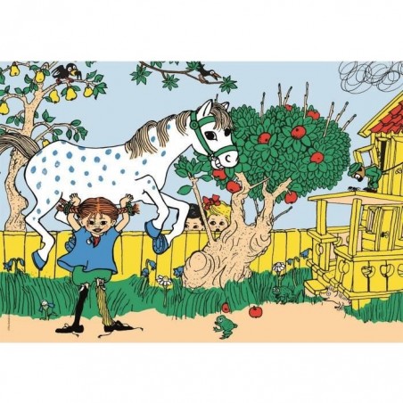 Un puzzle de 30 pièces à l'effigie de Fifi Brindacier qui porte un cheval. Dimensions 33,5 x 23,5 cm.