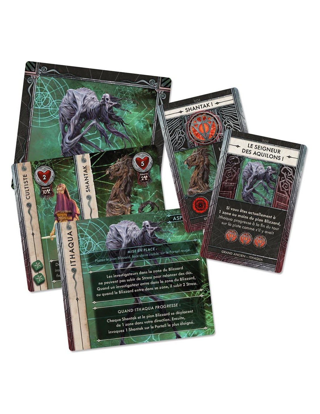 Les Shantaks sont d'énormes monstres aviaires à tête de cheval qui assistent les Anciens. Ces créatures sont incroyablement robustes et leur résistance fait qu'il est difficile pour les investigateurs de les éliminer rapidement. Grâce à leur longue affiliation à Ithaqua, les Shantaks ont appris à utiliser les violents blizzards du Grand Maître pour pénétrer dans notre royaume. Pire encore, tant qu'ils sont à proximité d'un blizzard, ils sont sous leur forme la plus effrayante, ce qui oblige les investigateurs à se stresser avant d'attaquer ou d'être attaqués. Ainsi, les Shantaks font constamment baisser le stress des investigateurs, entravant leur capacité à manipuler les jets de dés. Plus vite vous vous débarrasserez de ces monstres, mieux ce sera - ce qui serait beaucoup plus facile si ce n'était de leur résilience susmentionnée... Nécessite le jeu de base. La boîte Cthulhu : Death May Die - Ithaqua Le Marche-Vent est livrée avec :