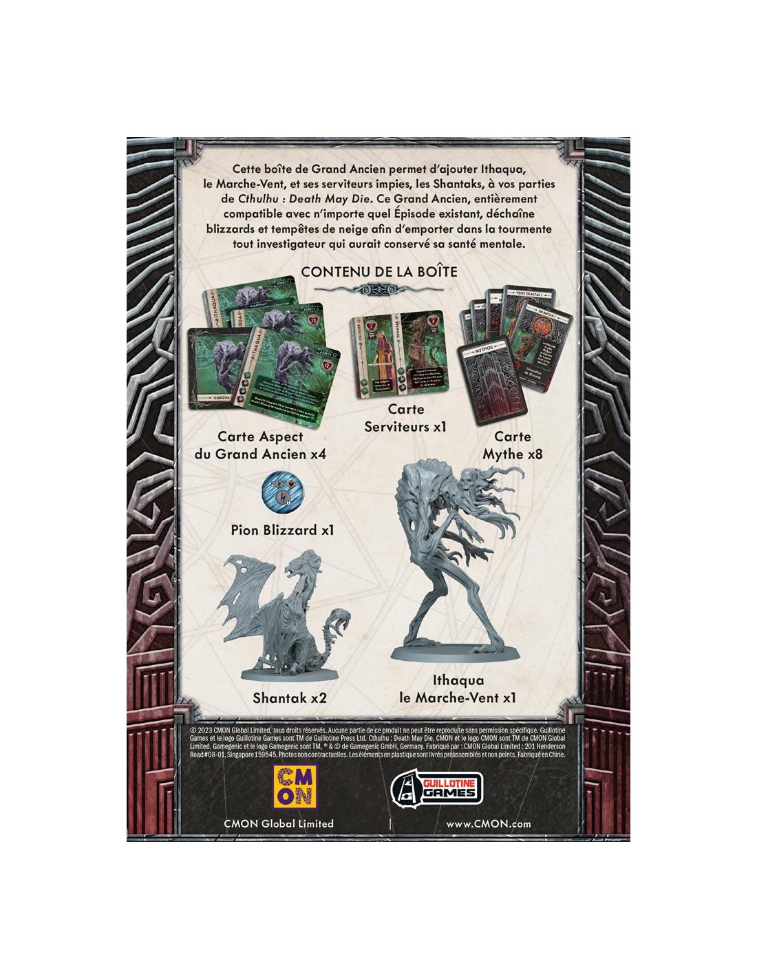 Ithaqua le Marcheur de Vent est une boîte qui contient un nouvel Ancien que vous pouvez utiliser en combinaison avec n'importe quel épisode (de n'importe quelle saison !) pour créer une toute nouvelle expérience de jeu en essayant de vaincre les périls du Marcheur de Vent et de ses disciples Shantaks !Ithaqua, le fils d'Hastur et Seigneur des Vents, est un Grand Ancien puissant à part entière, un géant terrifiant qui rôde dans les étendues gelées et tue tous ceux qu'il croise dans la poursuite de son objectif de libérer les autres Grands Anciens. Il a le pouvoir de rassembler et de contrôler les blizzards et les violentes tempêtes de neige, et ce n'est pas différent dans Death May Die, car chaque fois qu'Ithaqua est l'Ancien choisi, un jeton blizzard est placé sur le plateau de jeu, obligeant tout investigateur qui le saisit à maximiser son stress et à être incapable de le soigner. Pire encore, à chaque fois qu'Ithaqua avance, le blizzard se dirige vers les investigateurs, invoquant un Shantak au milieu de la tempête. À partir de là, les choses ne font qu'empirer pour les investigateurs. À mesure qu'Ithaqua se rapproche de notre royaume, le blizzard s'intensifie, se déplaçant plus fréquemment sur le plateau, causant plus de stress, de dégâts et empêchant tout mouvement. Bien sûr, en tant que Seigneur des vents, tous ses cultistes sont totalement immunisés contre le gel et peuvent attaquer les investigateurs en toute liberté. Ithaqua apporte avec lui ses effets météorologiques dévastateurs sur le plateau, offrant une toute nouvelle expérience dans la lutte contre les Anciens.