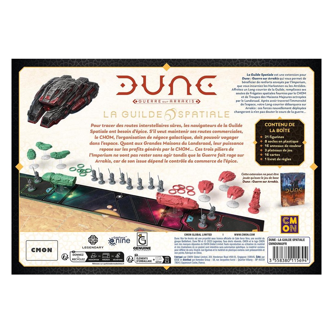 L'extension La Guilde Spatiale vous permet de bénéficier de renforts envoyés par l'Imperium, que vous incarniez les Harkonnen ou les Atréides. Affrétez un Long-courrier de la Guilde, remplissez ses soutes de Frégates spatiales fournies par le Chom et de Troupes des Maisons Majeures octroyées par le Landsraad.