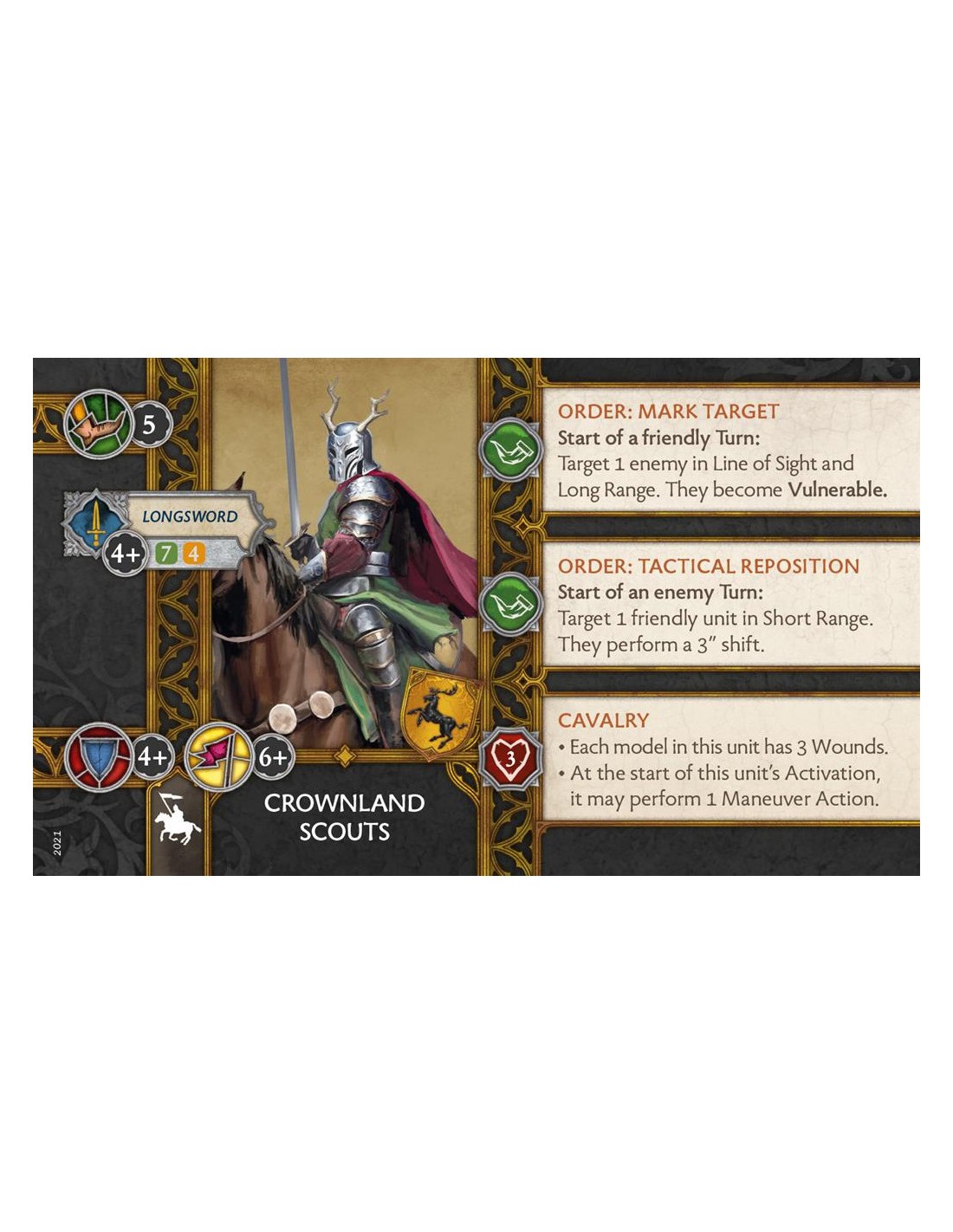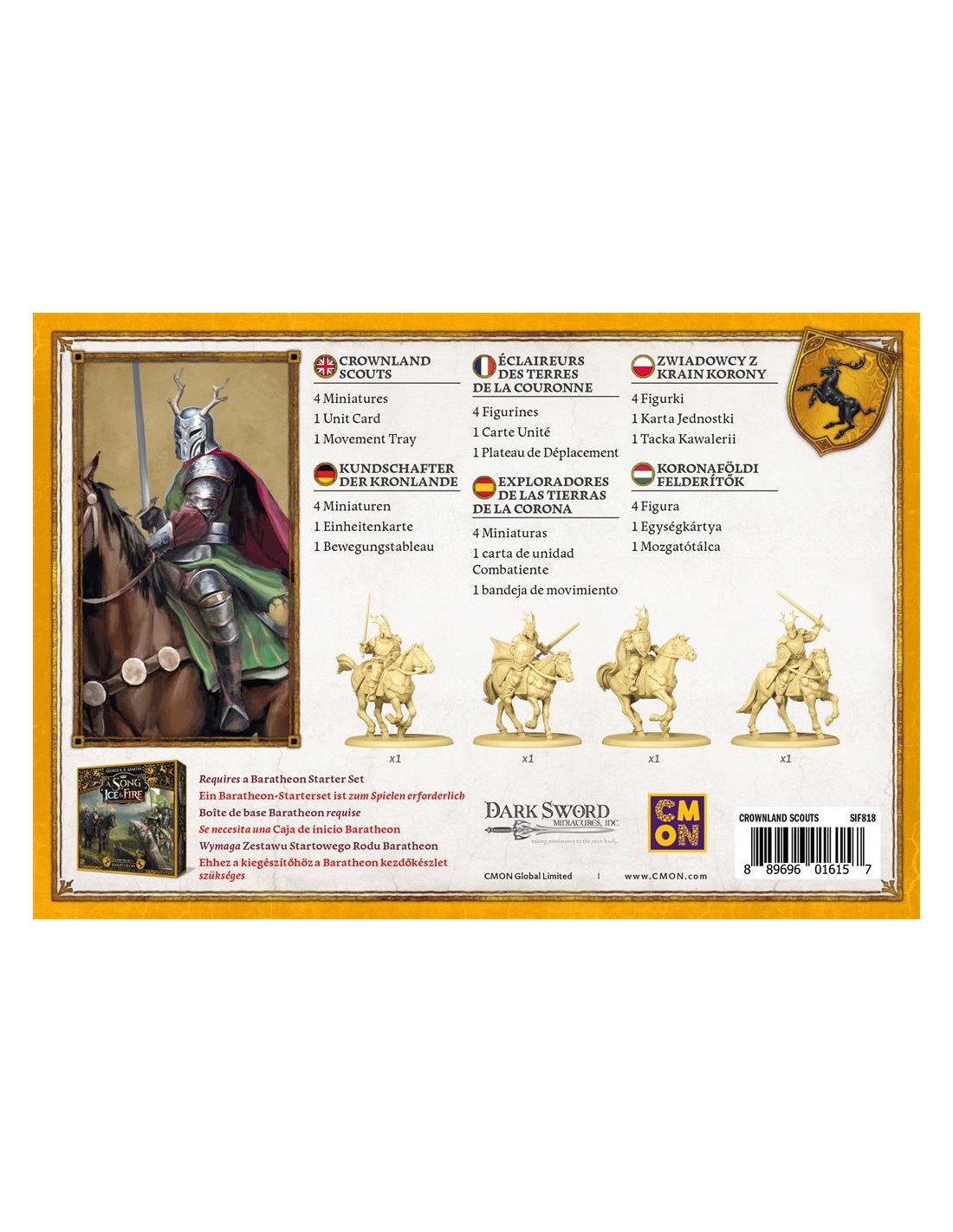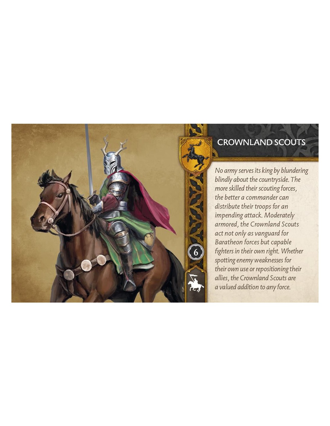 Les éclaireurs du Cerf sont les yeux et les oreilles des forces de la Maison Barathéon. Aucune armée ne sert son roi en parcourant la campagne à l'aveuglette. Plus les éclaireurs sont compétents, mieux le commandant peut répartir ses troupes en vue d'une attaque imminente. Les éclaireurs des Terres de la Couronne, sous les ordres du Cerf Baratheon, sont parmi les meilleurs des Sept Royaumes.