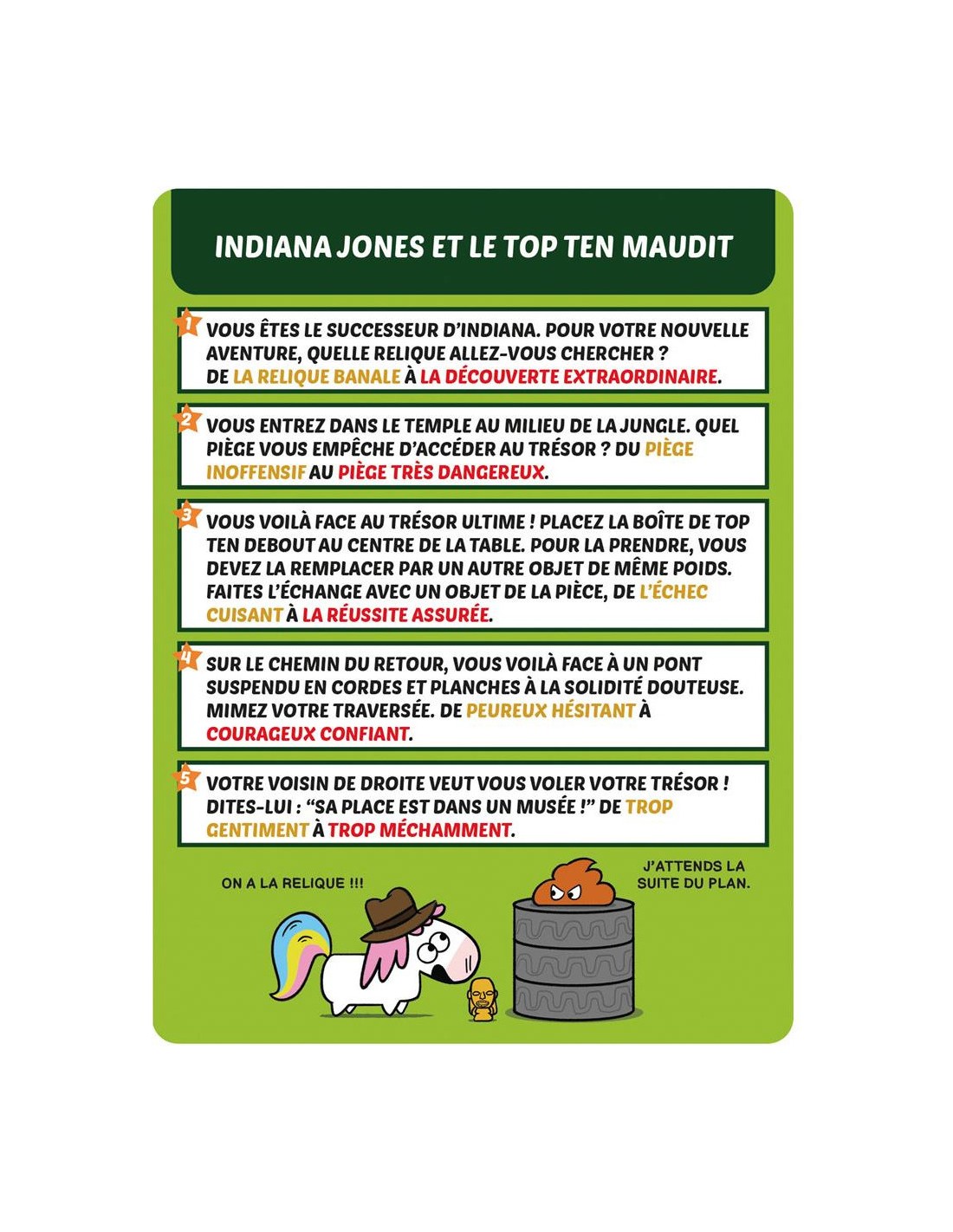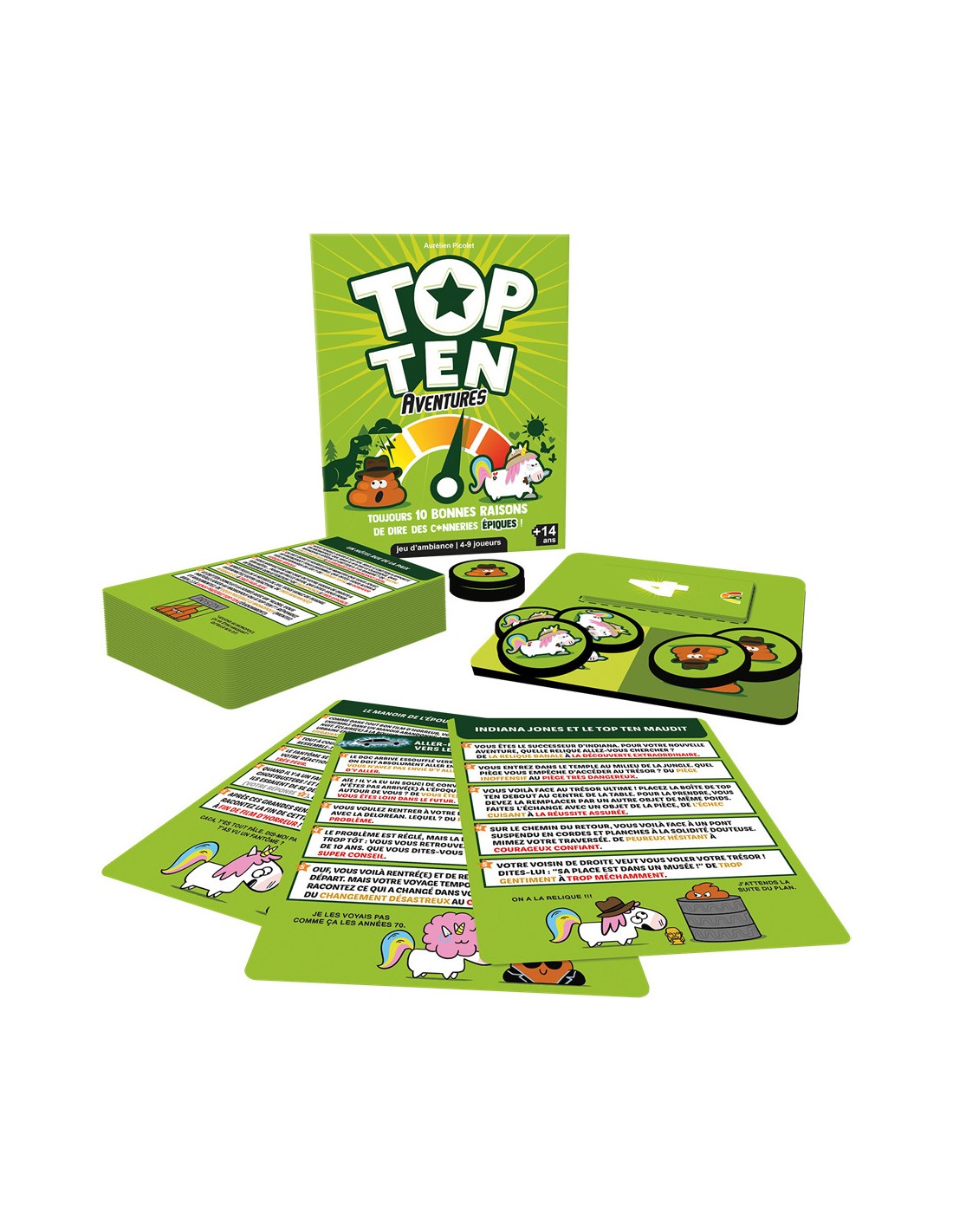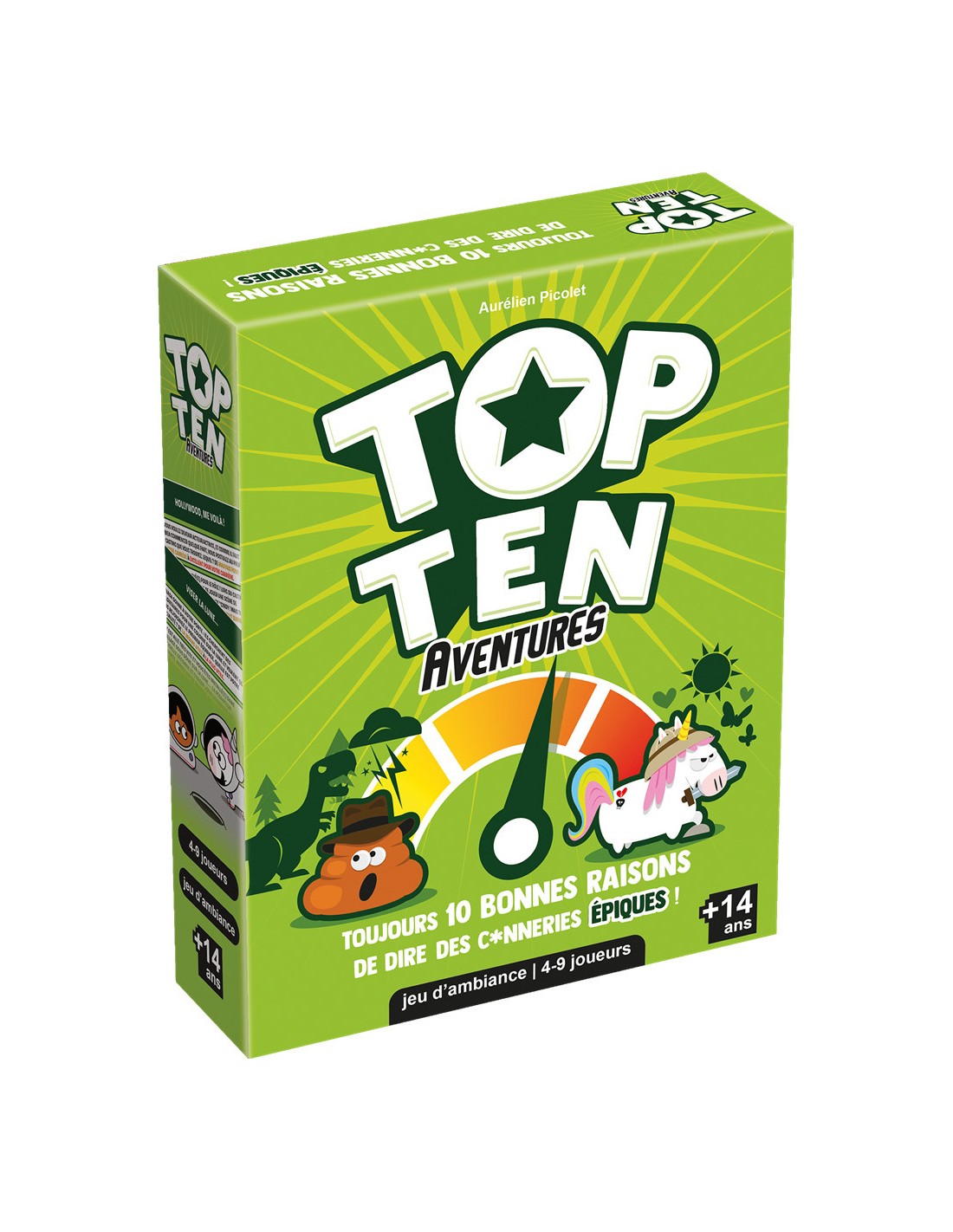 Avec ses scénarios à la chaîne formant des histoires délirantes, Top Ten Aventures renforce la dimension narrative du jeu original, sans en compliquer les règles. Chaque partie devient un récit coopératif tissé d’humour, de créativité et de surprises.