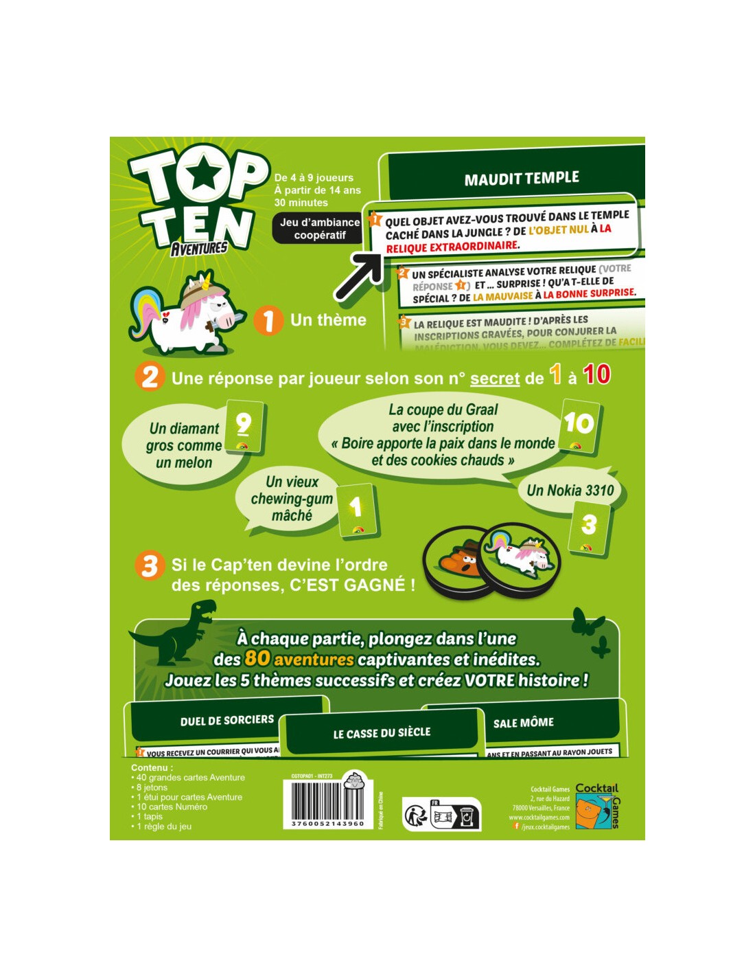 Dans le jeu Top Ten Aventures, relevez le défi tous ensemble tous ensemble dans une aventure thématique – fantasy, post-apo ou science-fiction – découpée en cinq situations rocambolesques.À chaque tour, un joueur devient le Cap’ten et lit un scénario déjanté à compléter selon une intensité (de 1 à 10).