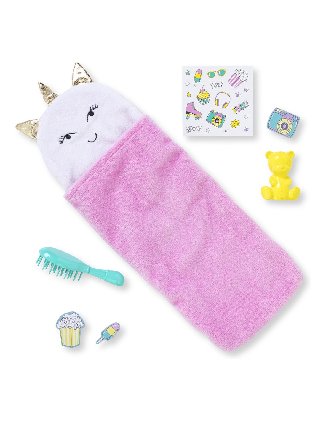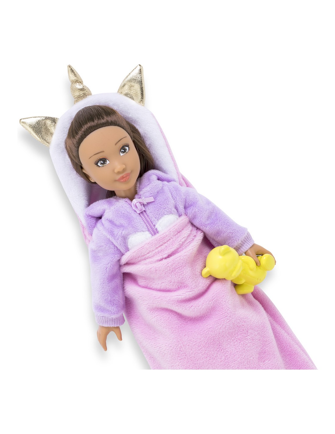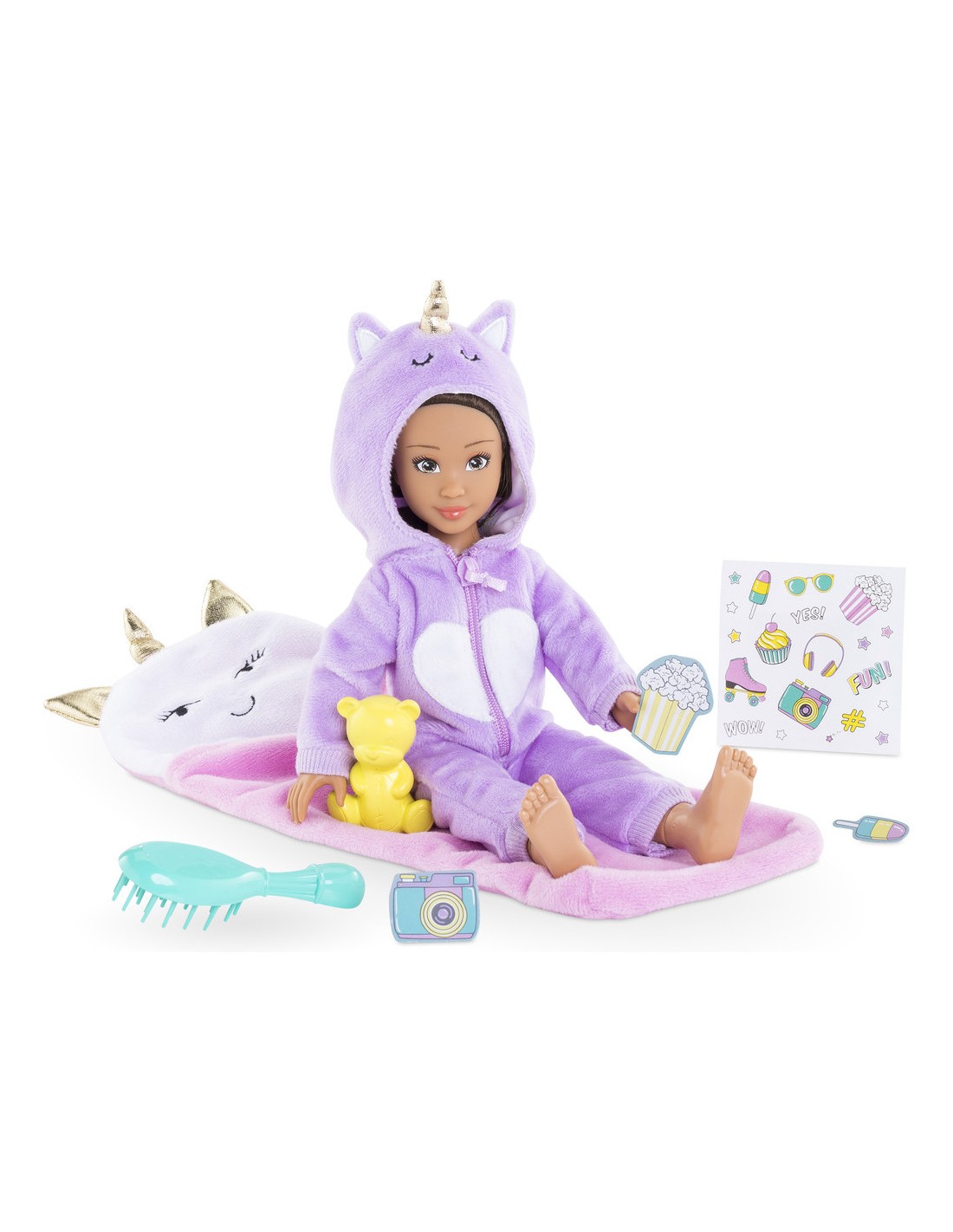 Le coffret Luna Pyjama Party est composé de Luna, une poupée mannequin de 28 cm, et de 7 accessoires : 1 sac de couchage, 1 brosse à cheveux, 1 ourson, 1 planche de stickers et 3 accessoires de jeu en carton ( 1 appareil photo, 1 glace, 1 paquet de pop-corn). Luna a un joli visage naturel aux traits fins qui sent bon la vanille.