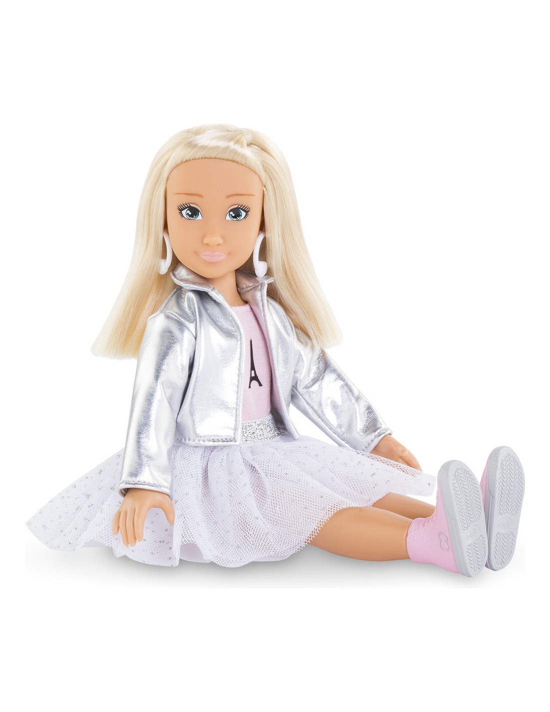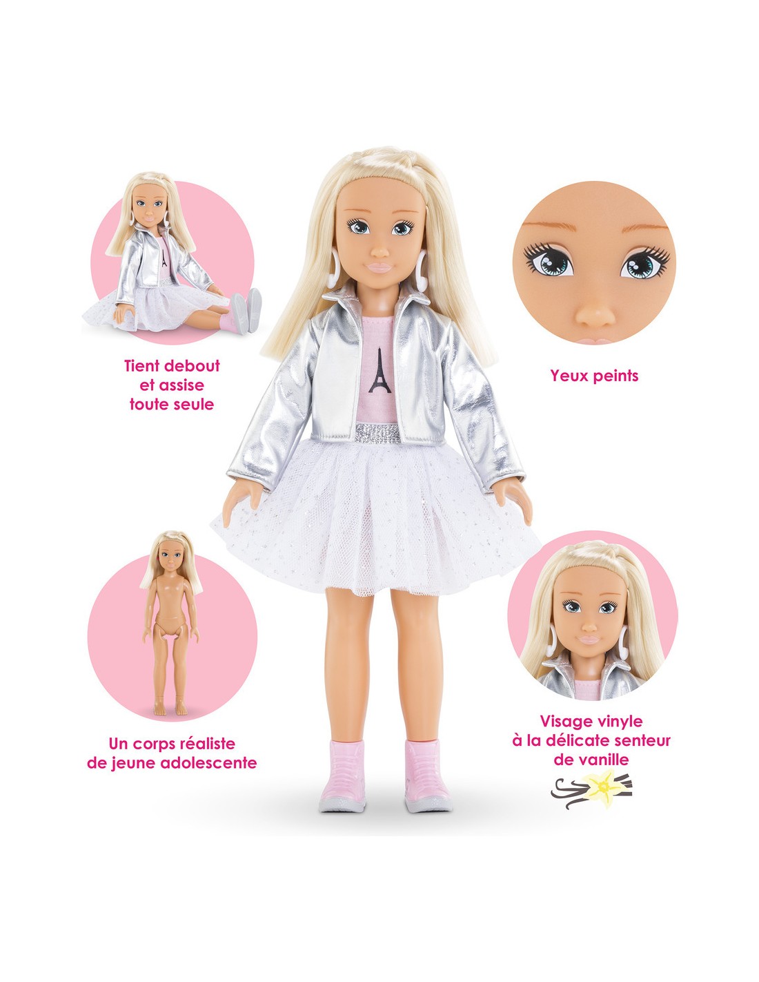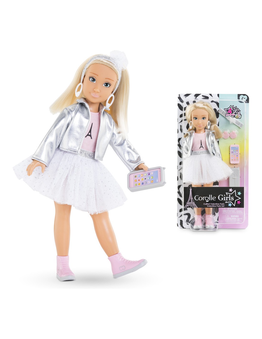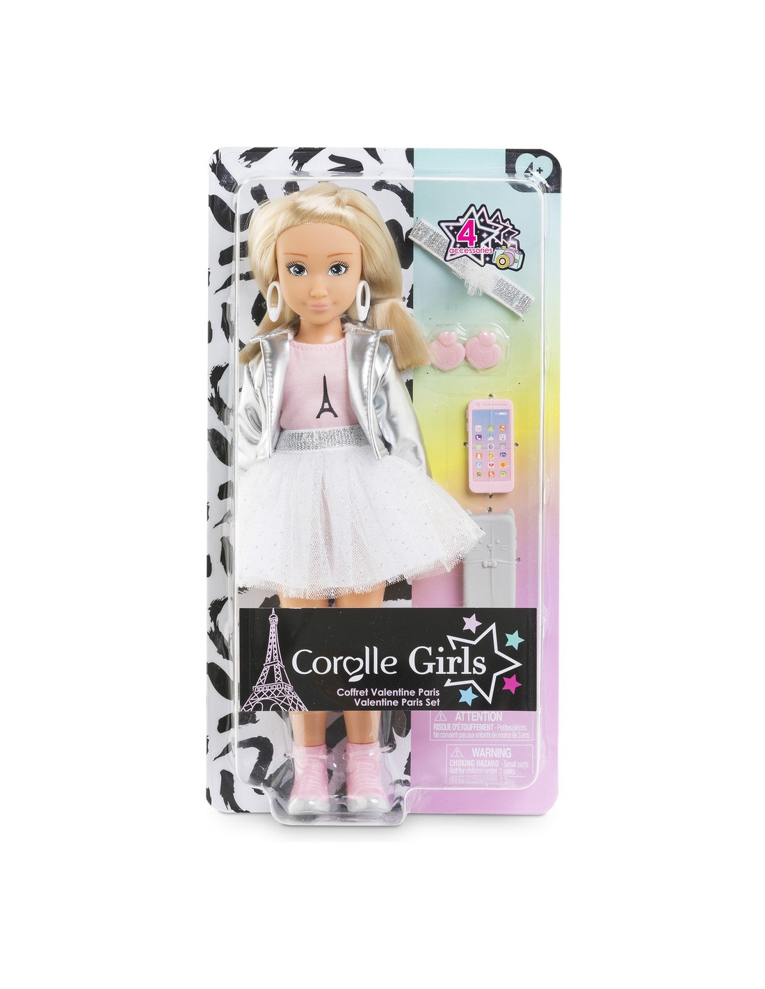 Ses yeux sont peints et elle possède des cheveux blonds mi-longs. Elle porte 1 jupe blanche en tulle, 1 T-Shirt rose, 1 veste, 1 paire de bottines roses amovibles et 1 paire de boucles d'oreille amovibles. Poupée mannequin à la peau blanche, Valentine a un corps réaliste de jeune adolescente. Elle tient assise et debout toute seule. Les Corolle Girls sont déclinées en plusieurs modèles et disposent de coffrets dressing pour encore plus de jeux ! Dès 4 ans.