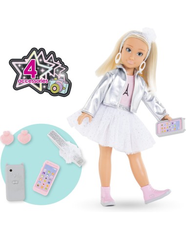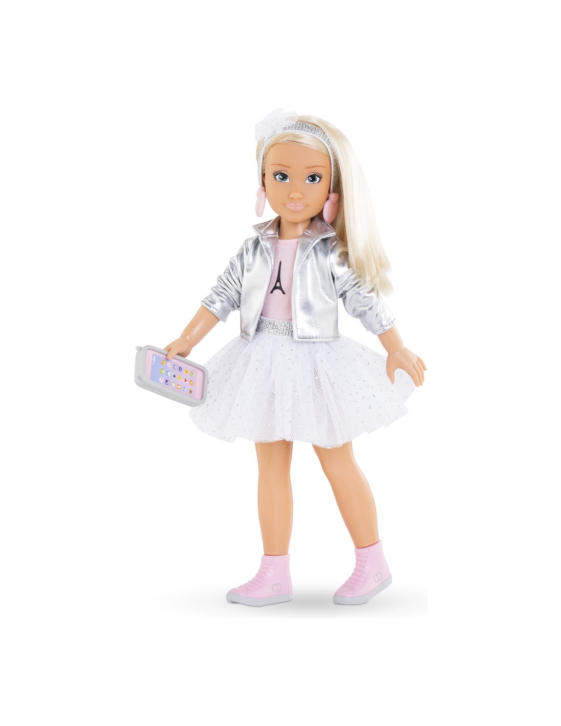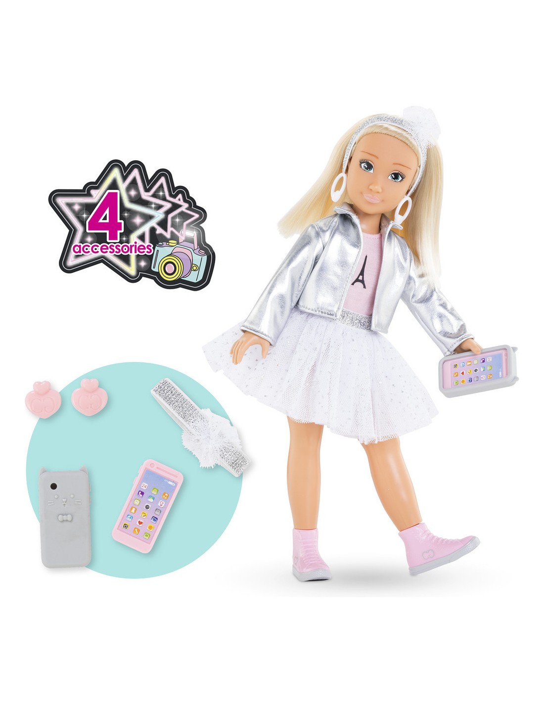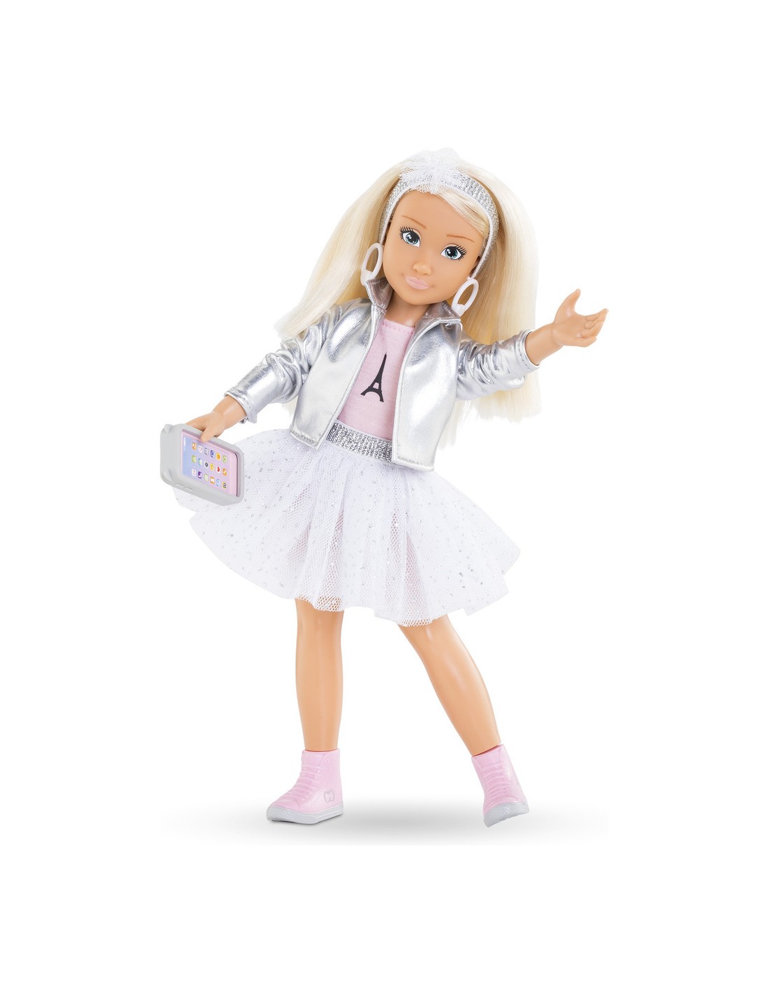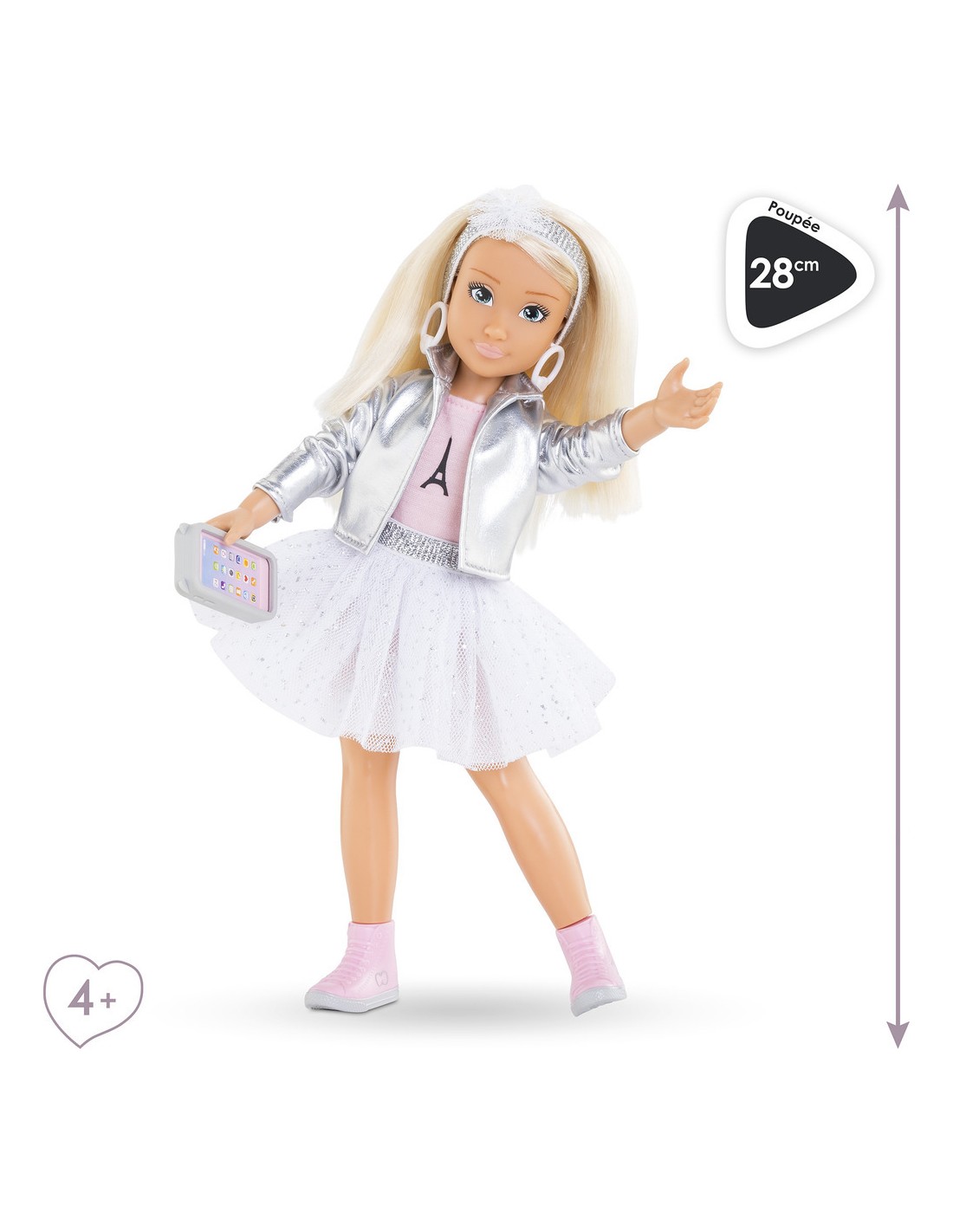 Ses yeux sont peints et elle possède des cheveux blonds mi-longs. Elle porte 1 jupe blanche en tulle, 1 T-Shirt rose, 1 veste, 1 paire de bottines roses amovibles et 1 paire de boucles d'oreille amovibles. Poupée mannequin à la peau blanche, Valentine a un corps réaliste de jeune adolescente. Elle tient assise et debout toute seule. Les Corolle Girls sont déclinées en plusieurs modèles et disposent de coffrets dressing pour encore plus de jeux ! Dès 4 ans.